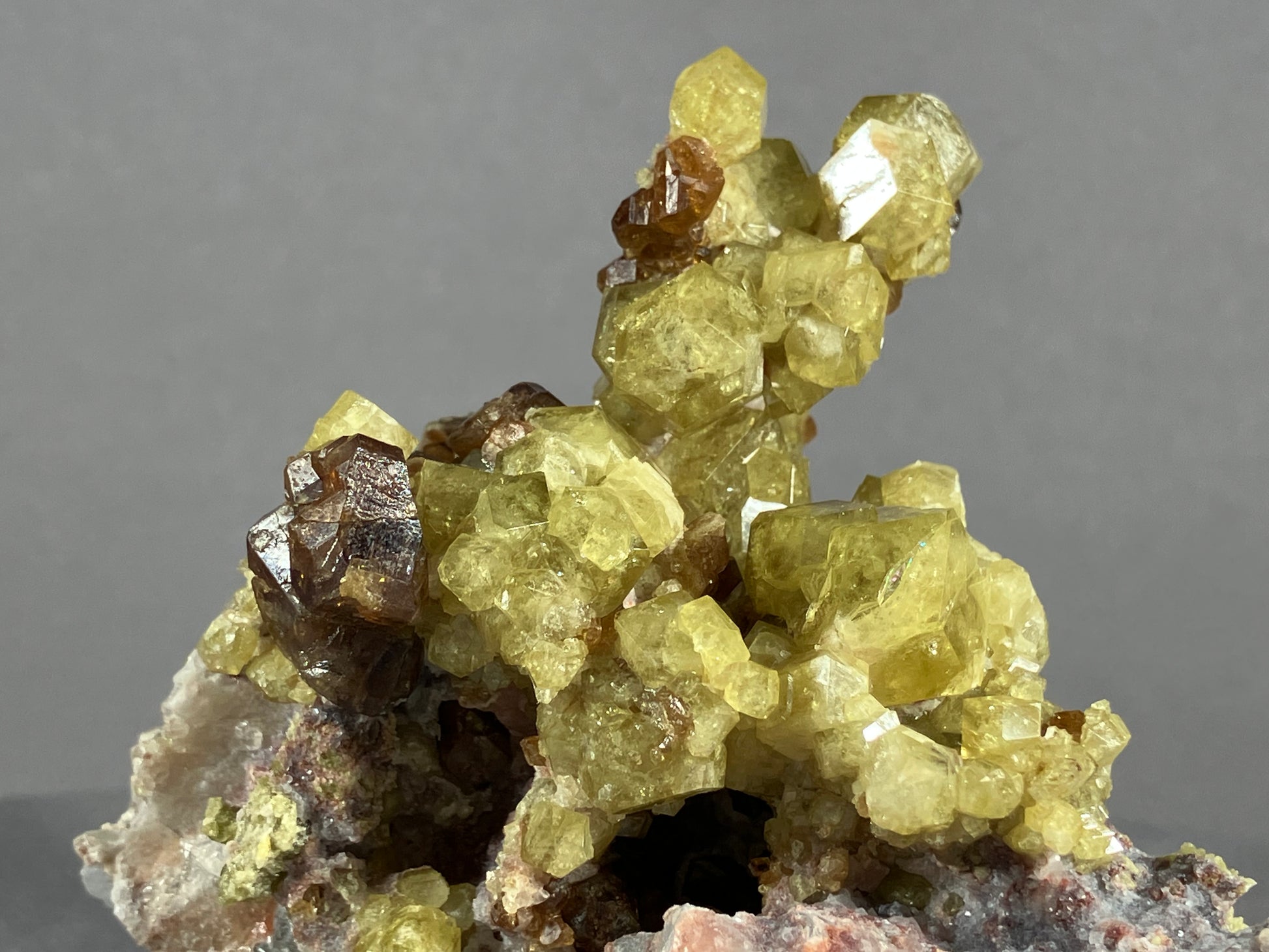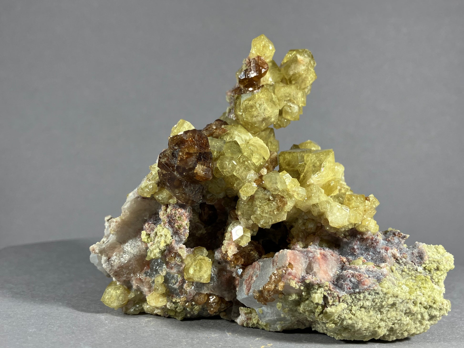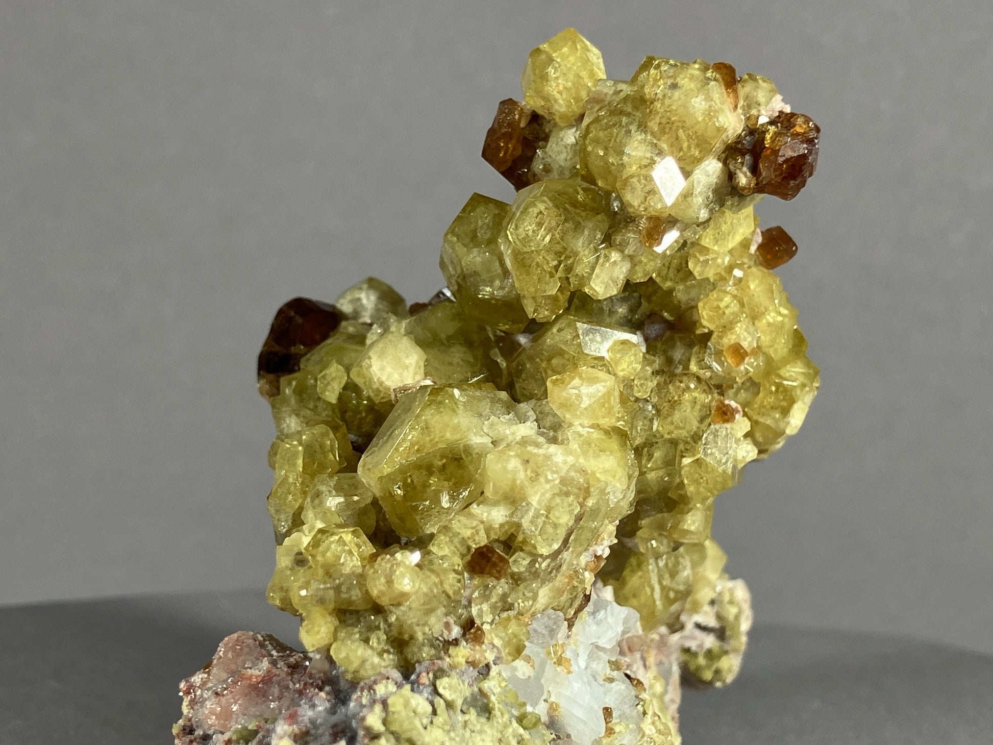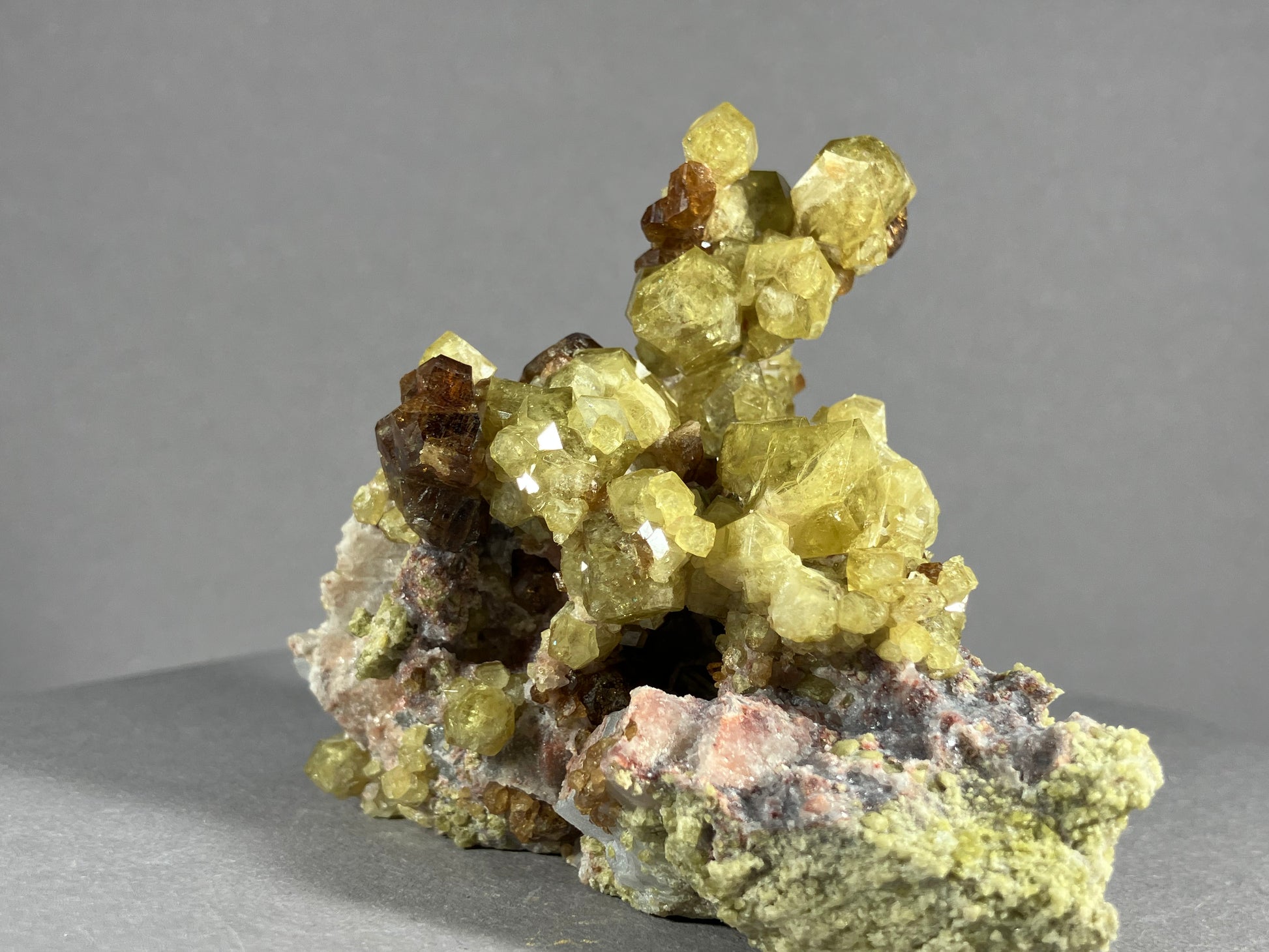 Was für ein wunderbares Stück. Gelbe Andraditkristalle (var. Topazolit) und braune gepaart auf einer super Stufe.