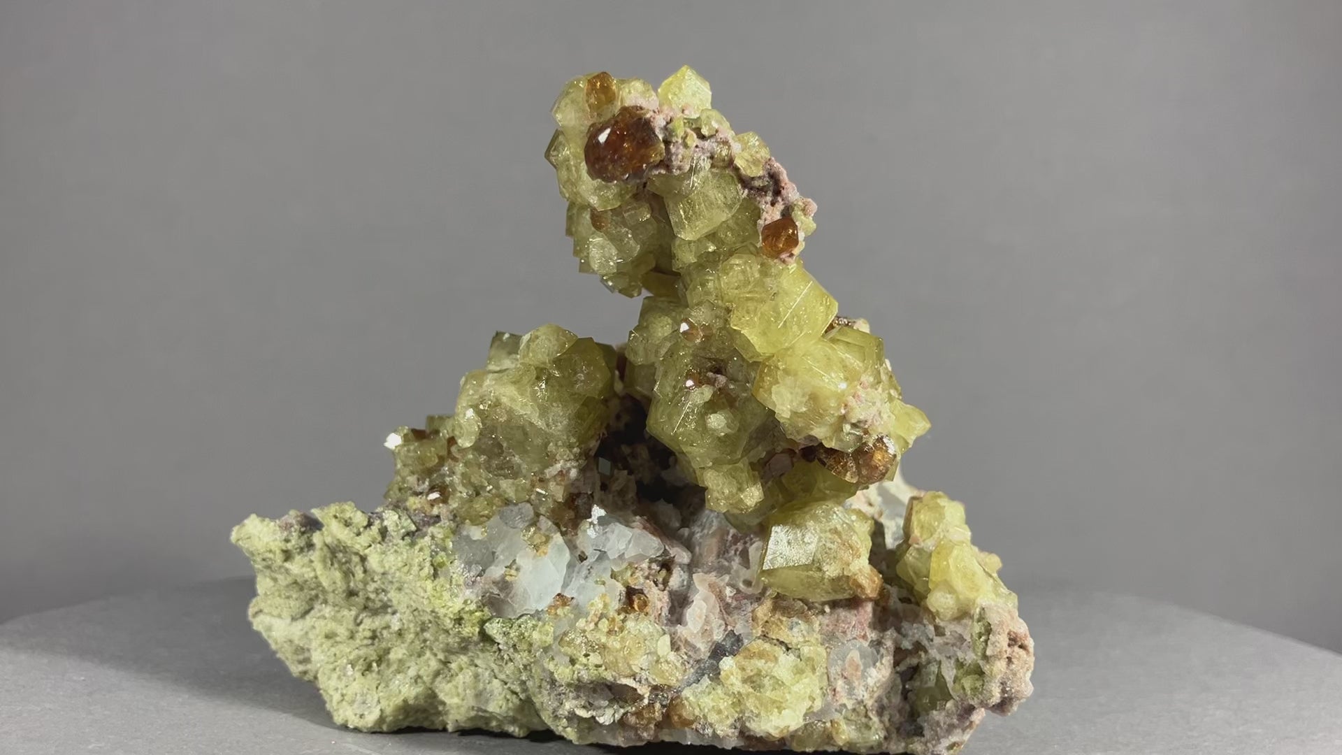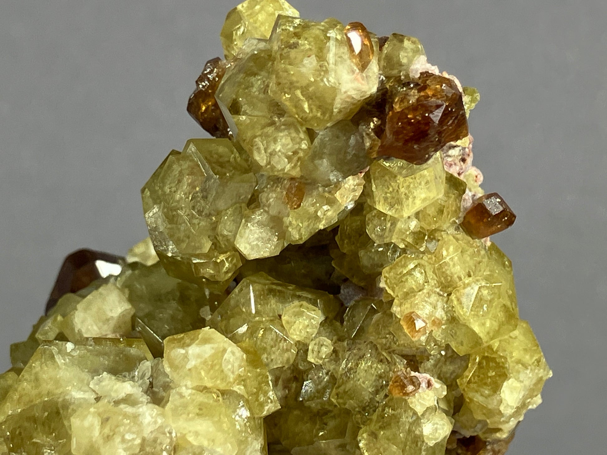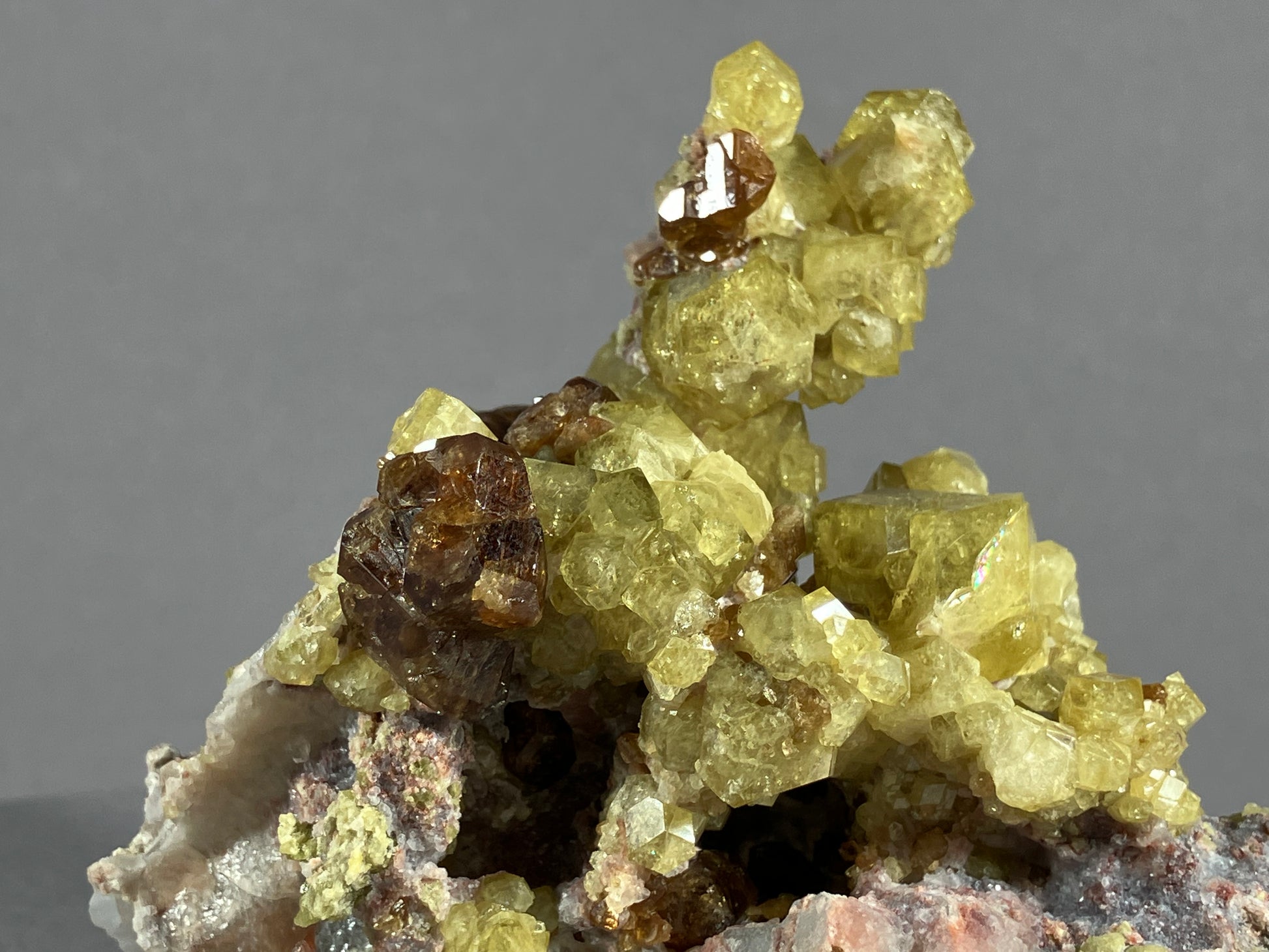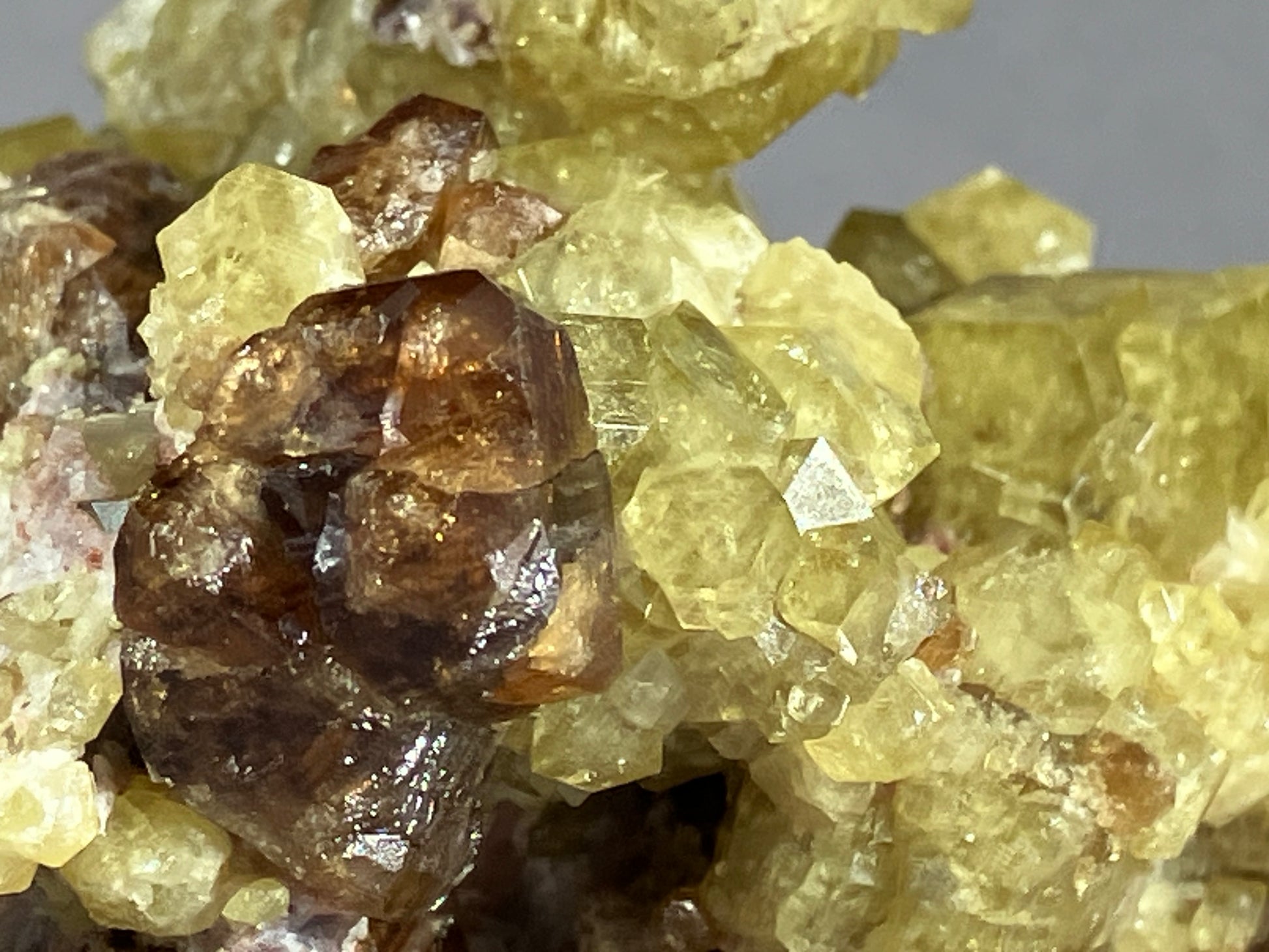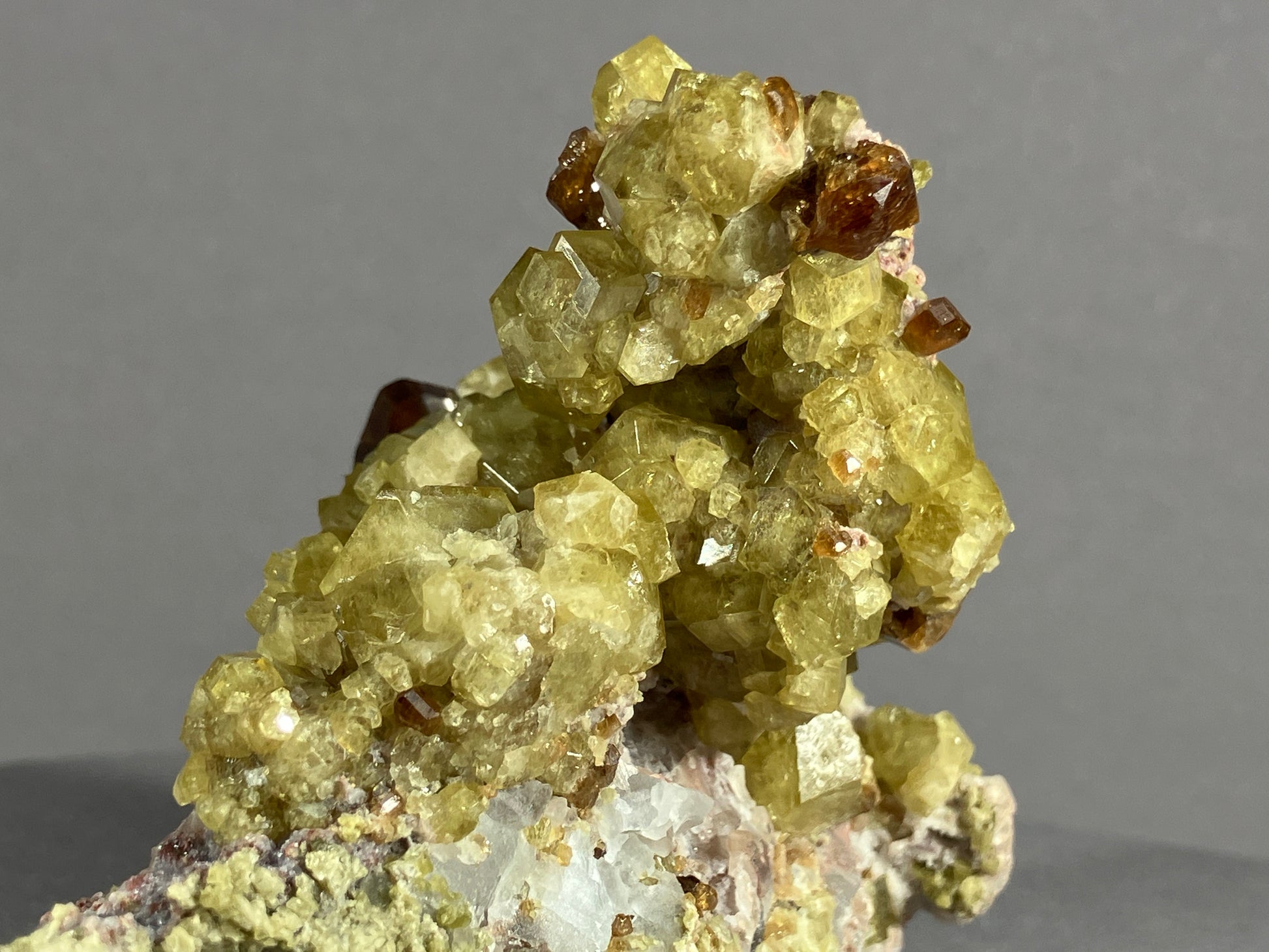 Was für ein wunderbares Stück. Gelbe Andraditkristalle (var. Topazolit) und braune gepaart auf einer super Stufe.