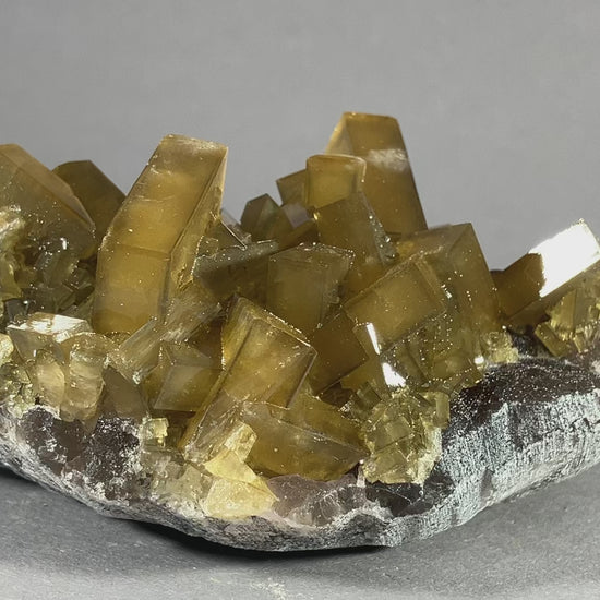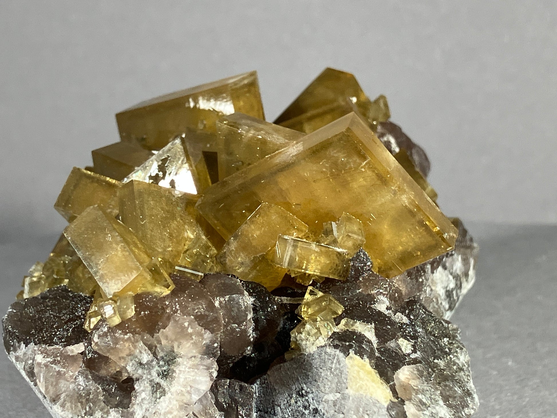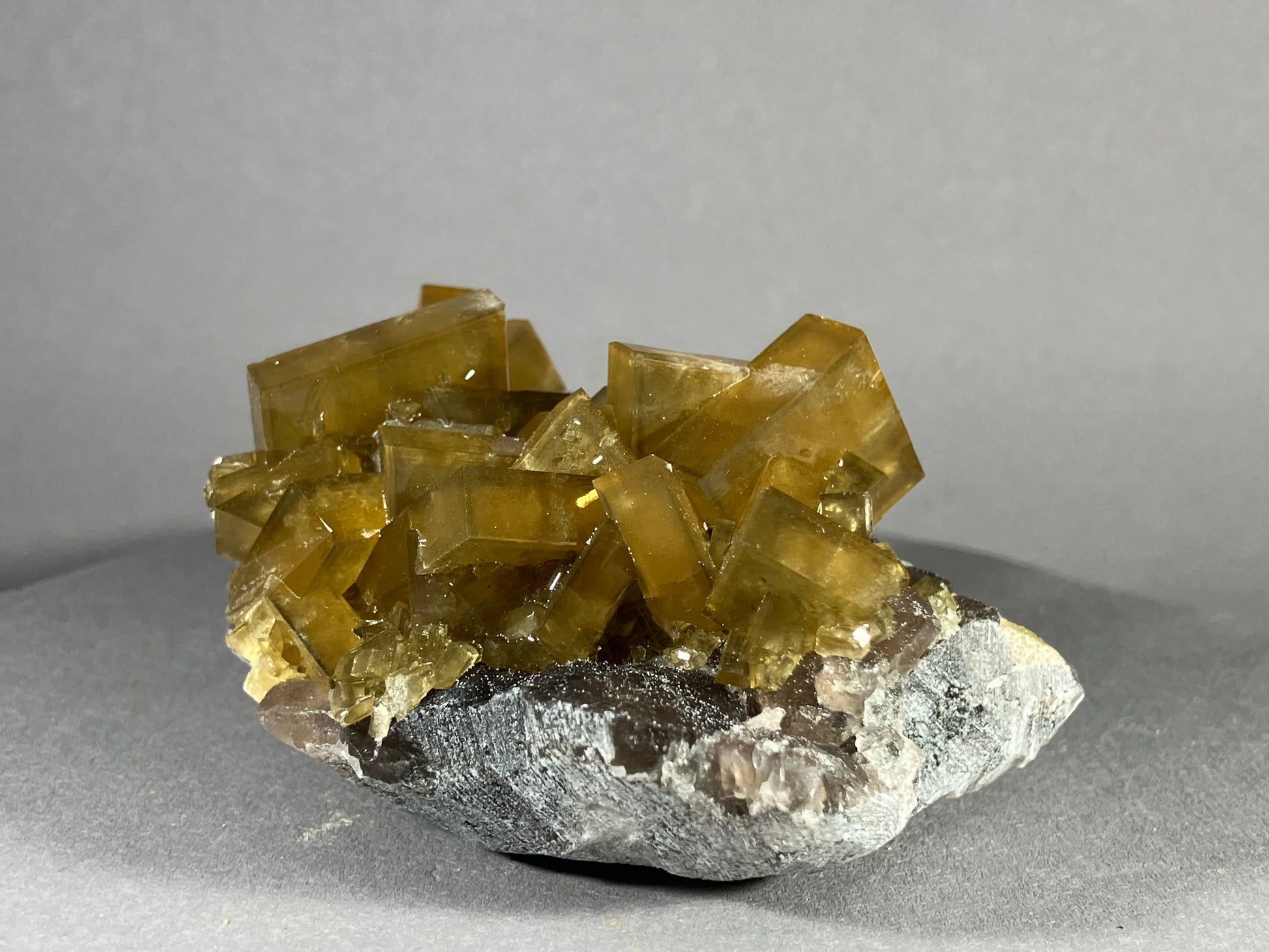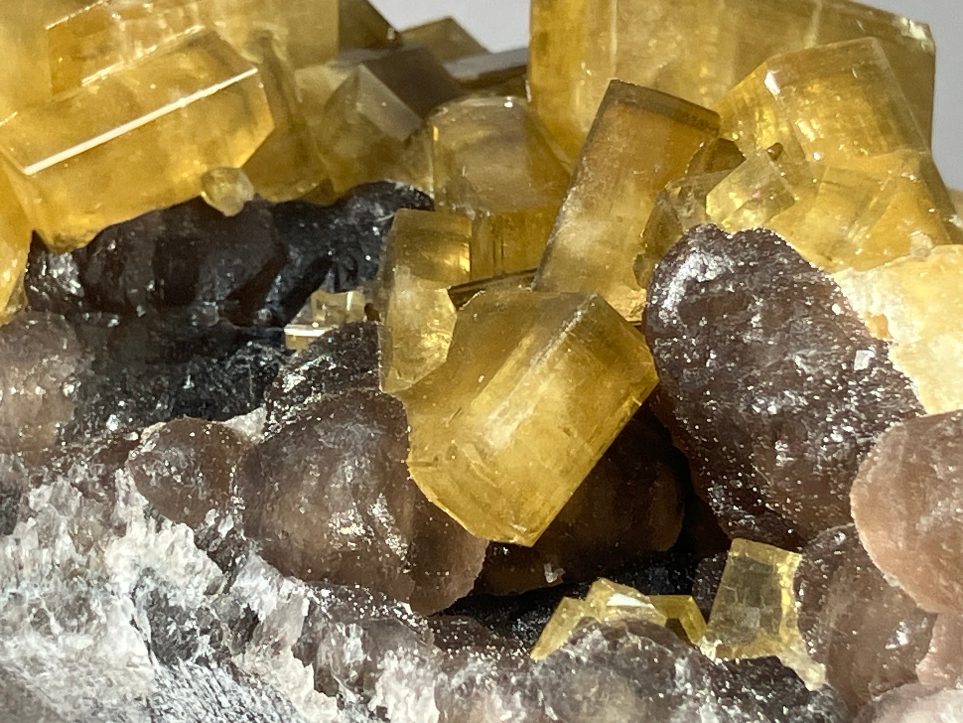 TOP! Barytkristalle in dicken honiggelben Tafeln sitzen auf dunklem Fluorit. Ein absolut schönes Stück für jede Sammlung.