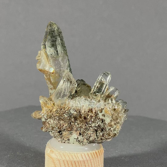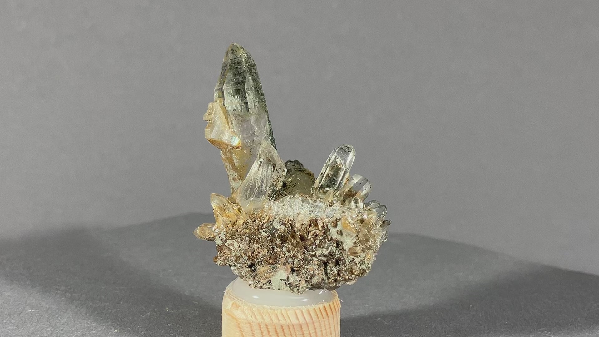 Nette kleine Bergkristallstufe mit teilweise Chloriteinschlüssen.