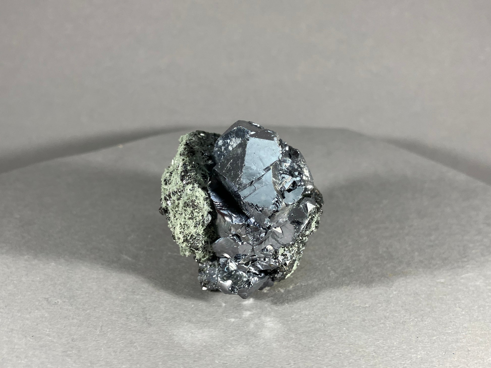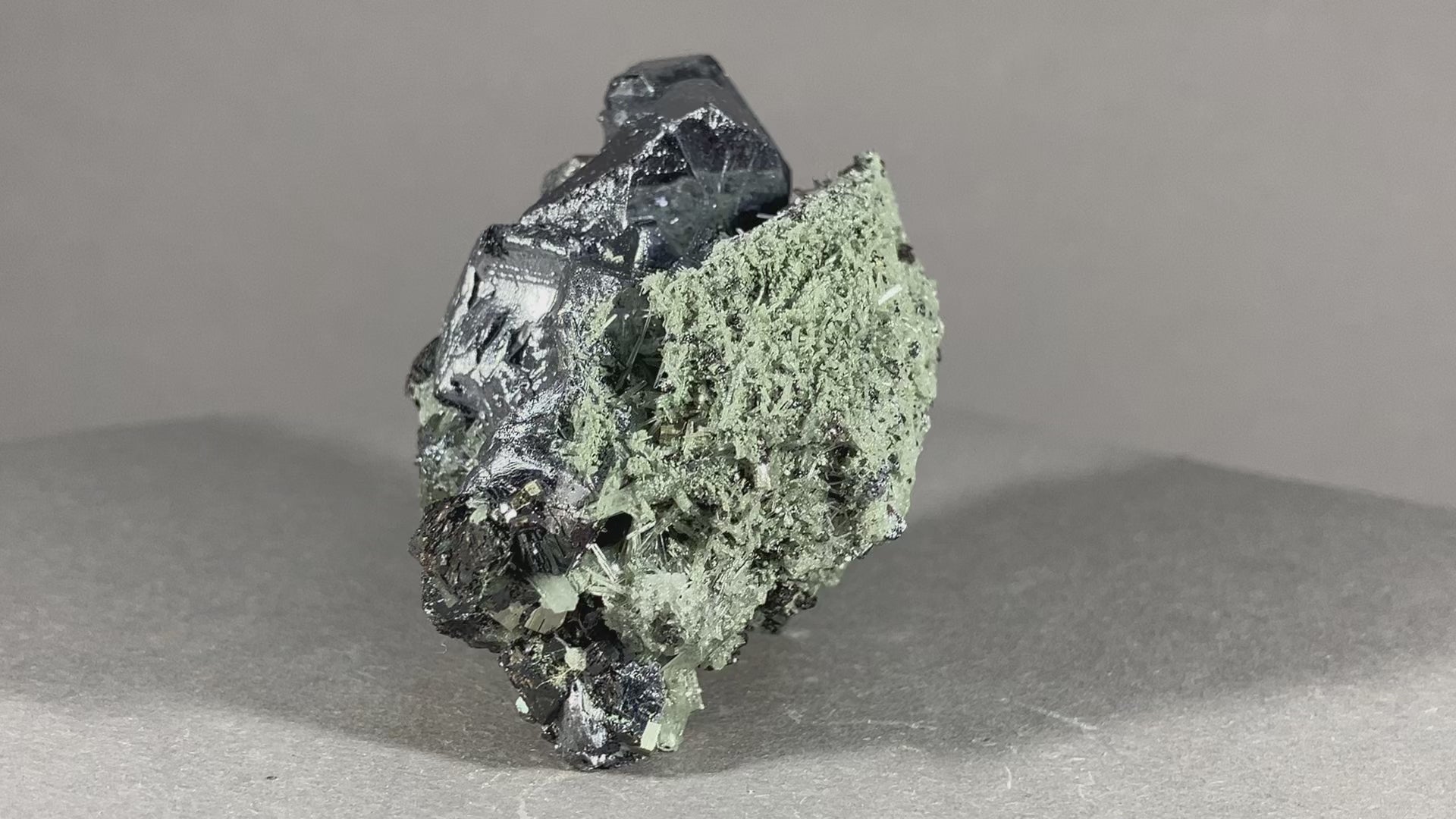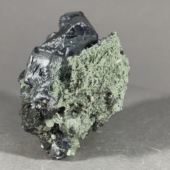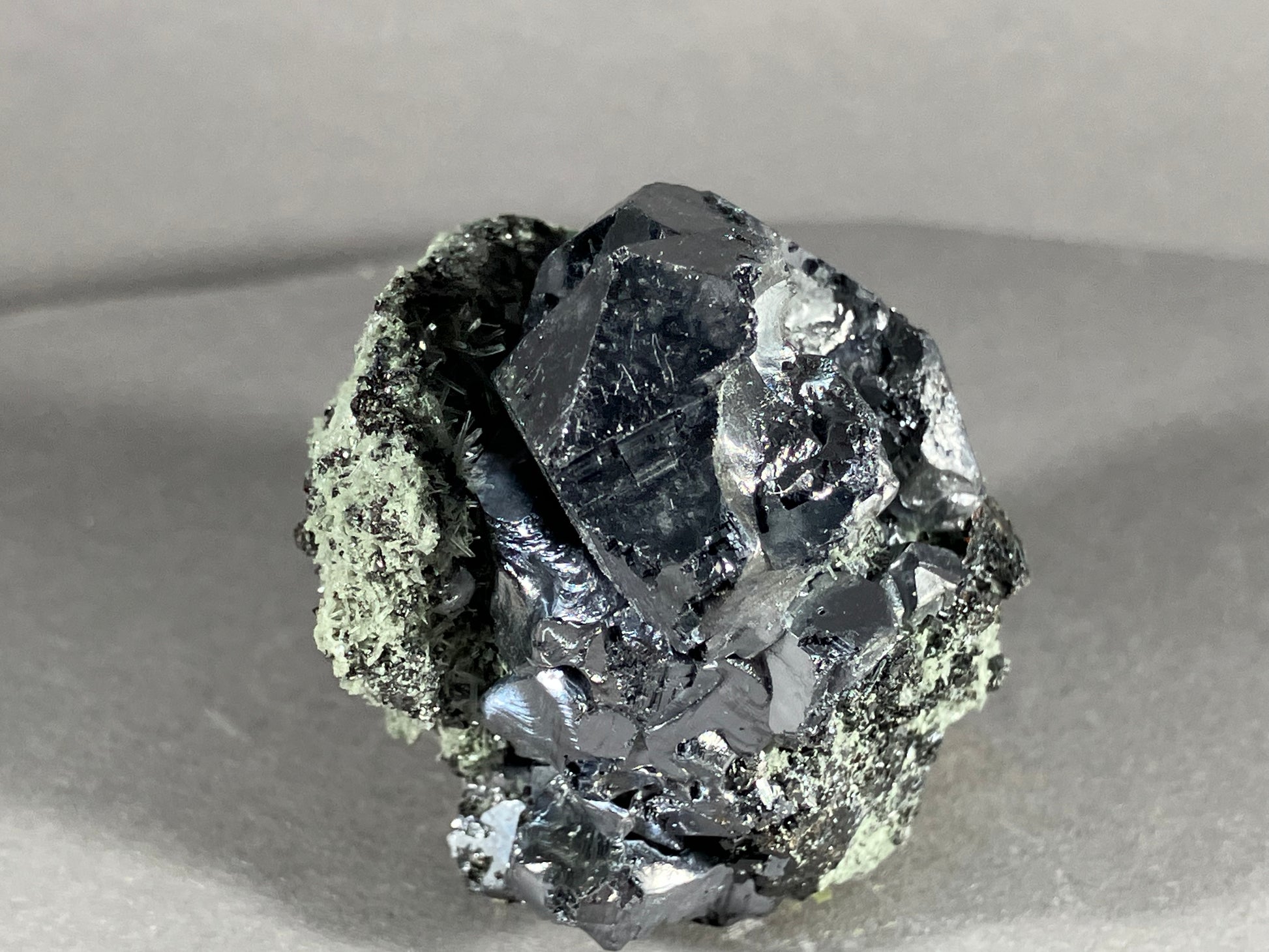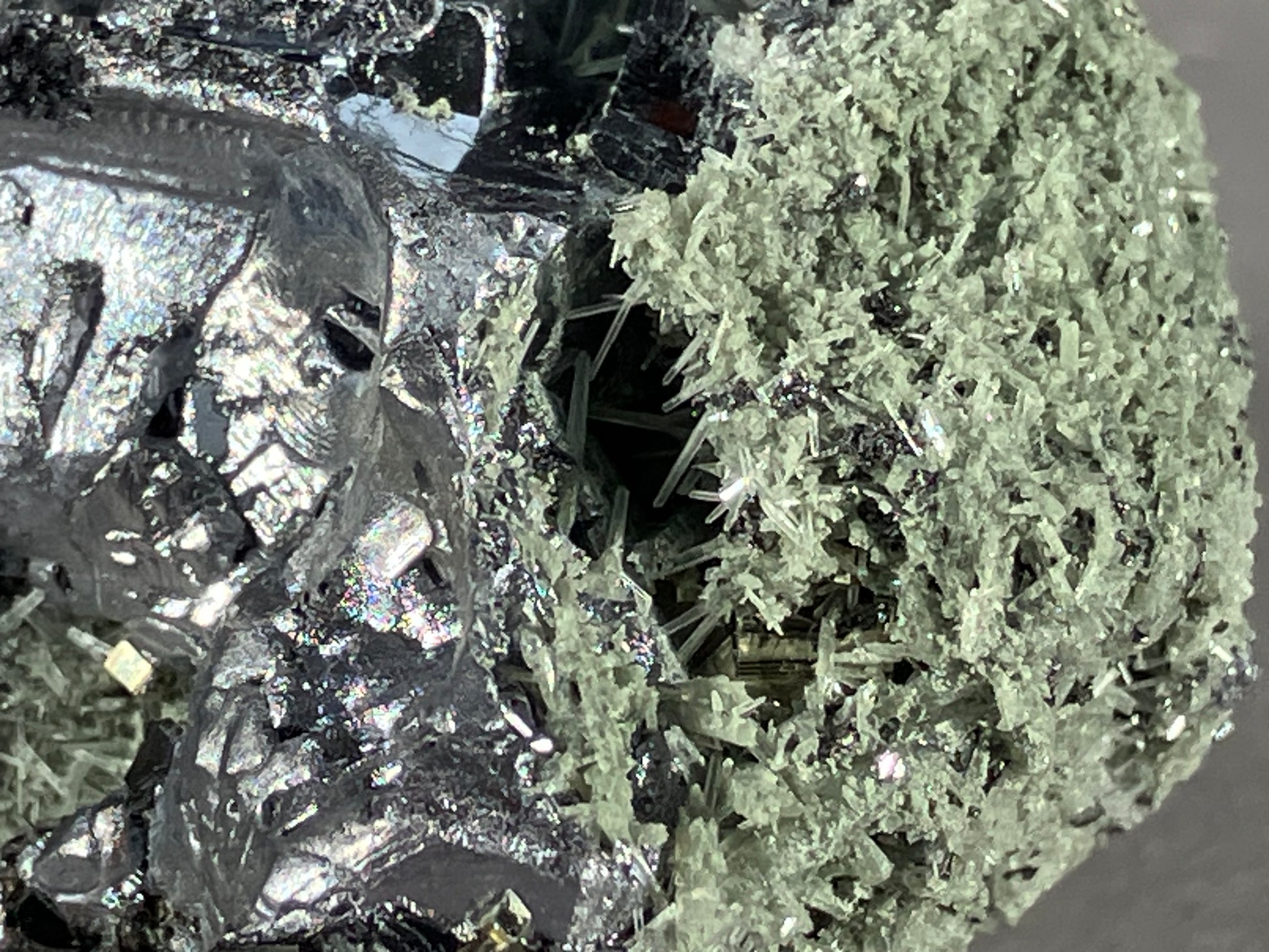 Hochglänzende Bleiglanzkristalle mit kleinen Nadelquarzen.