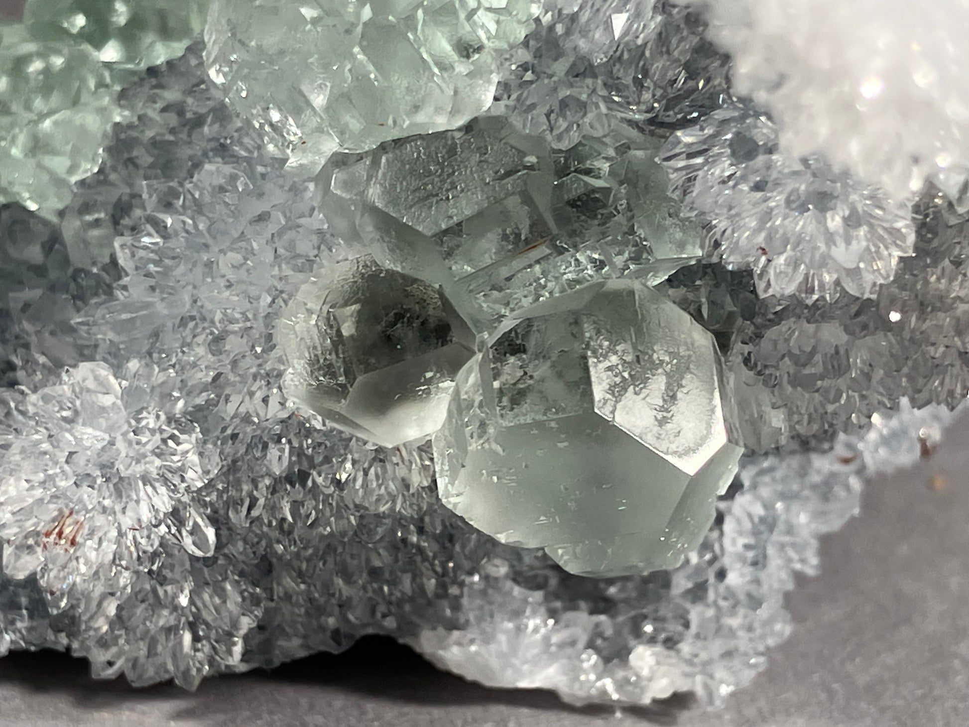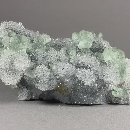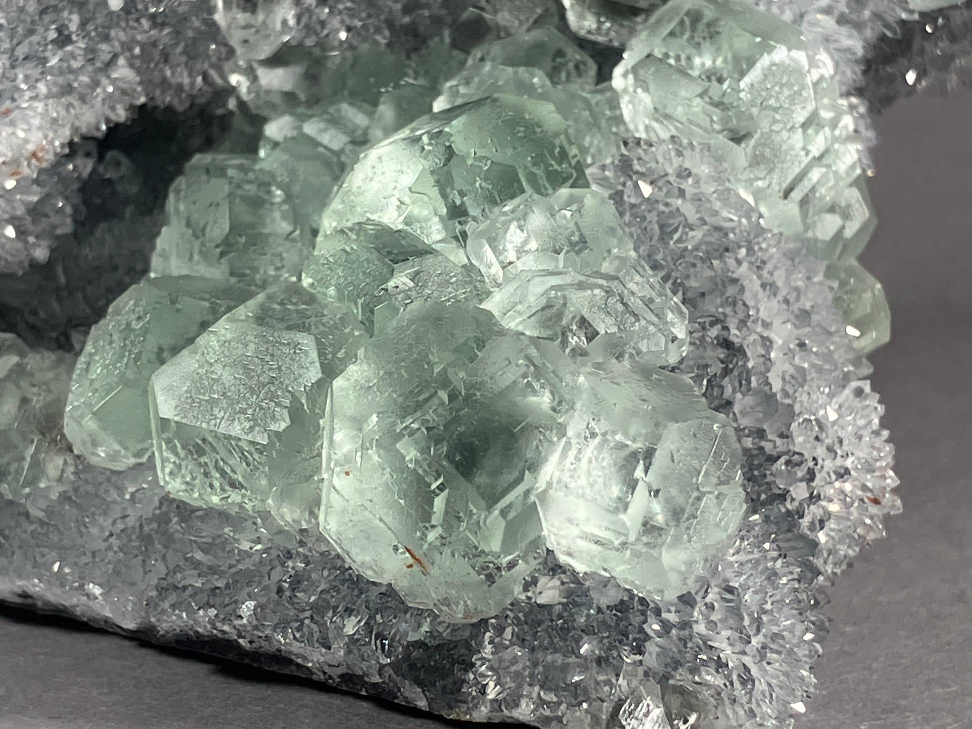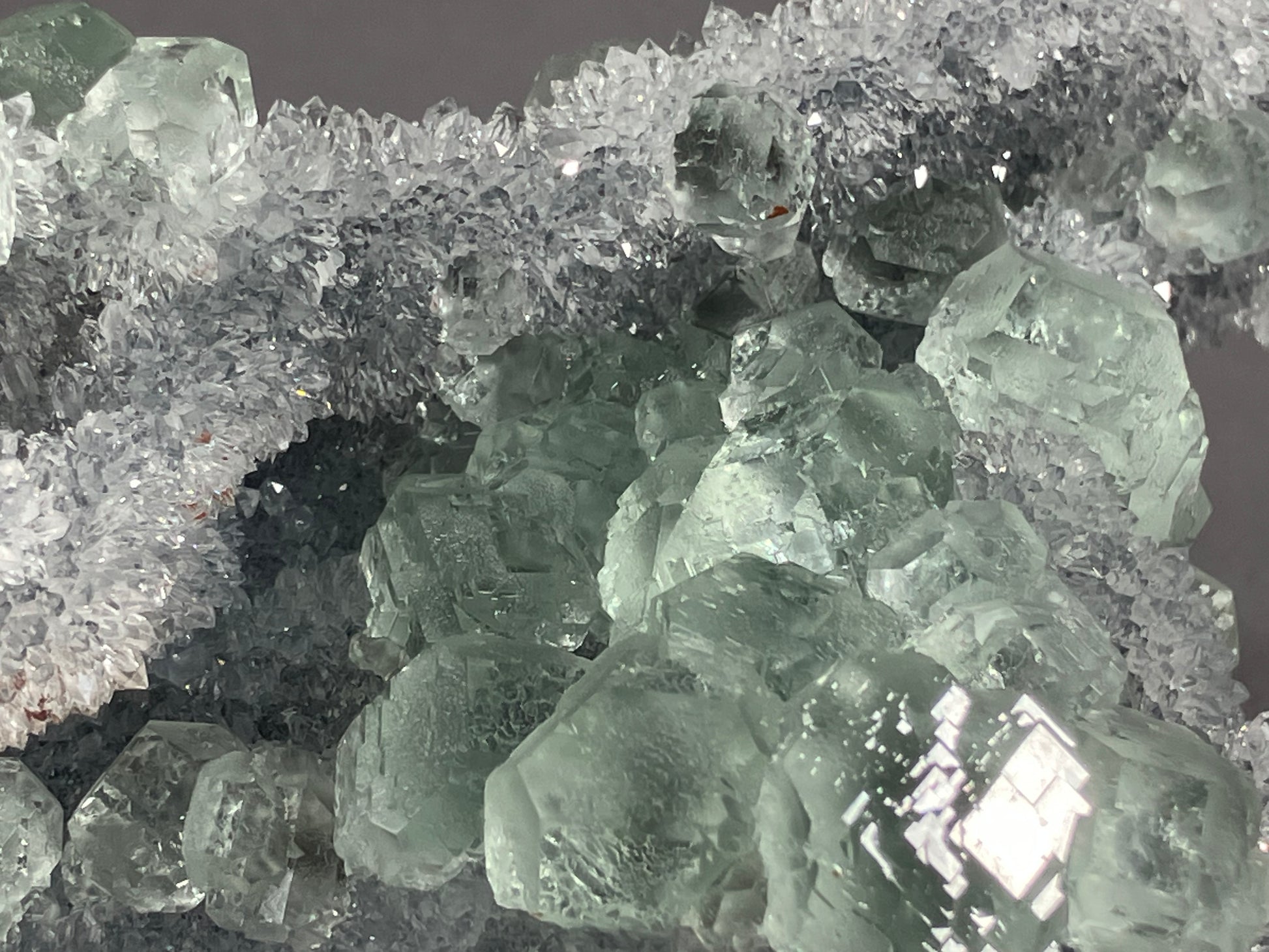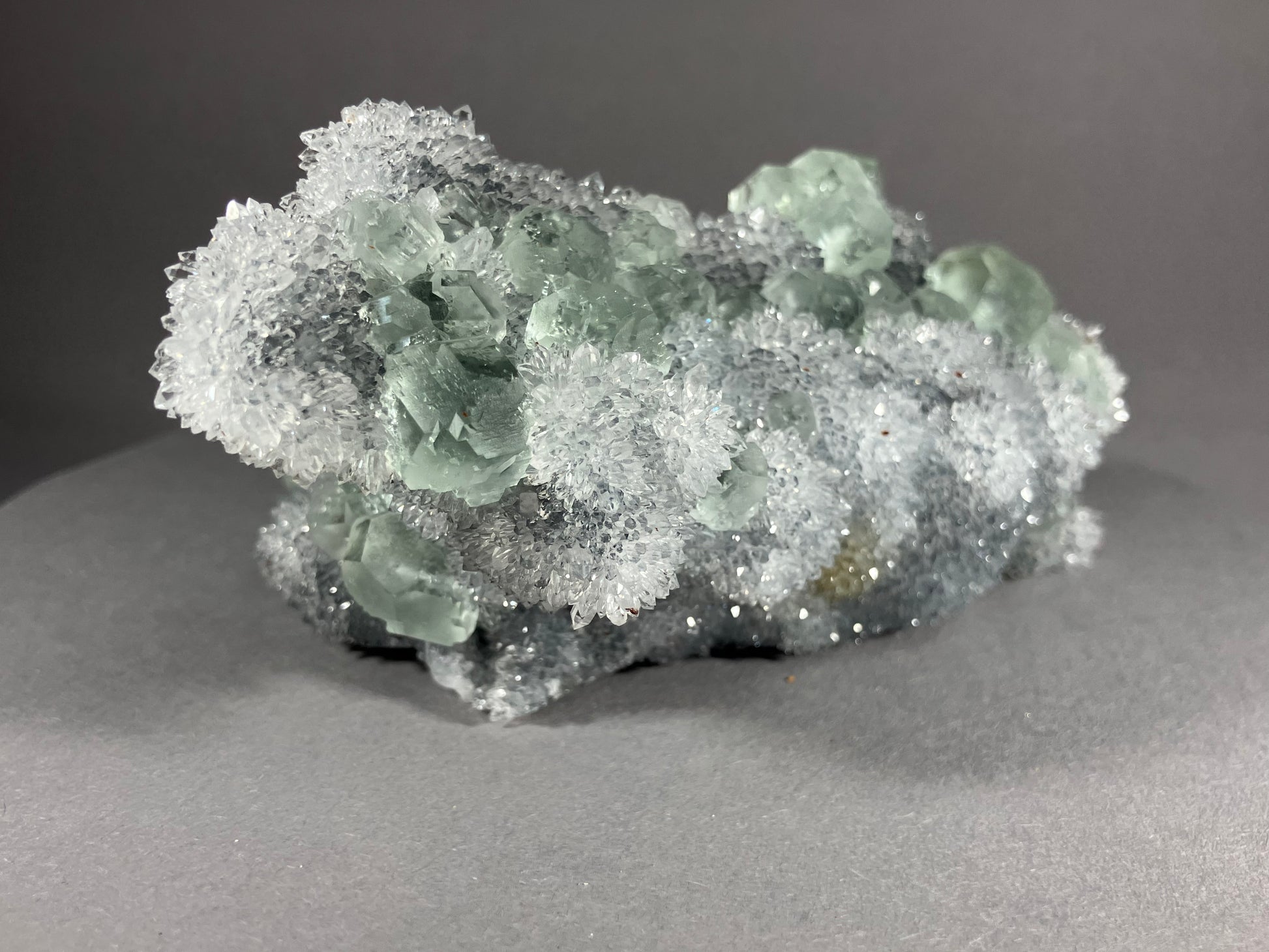 herrliche hellgrüne Fluoritkristalle auf hochglänzenden kleinen Bergkristallen aufgewachsen.