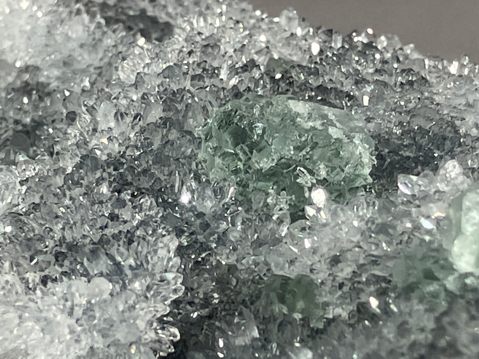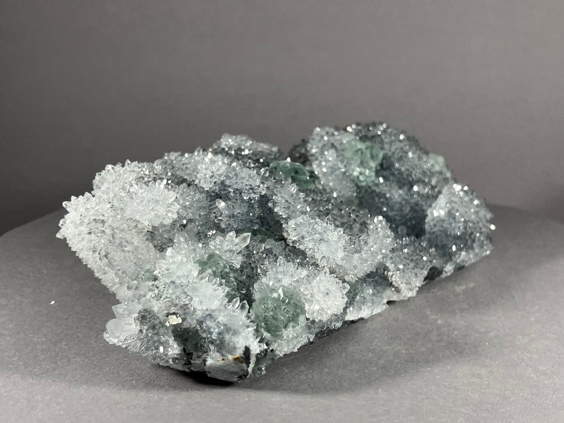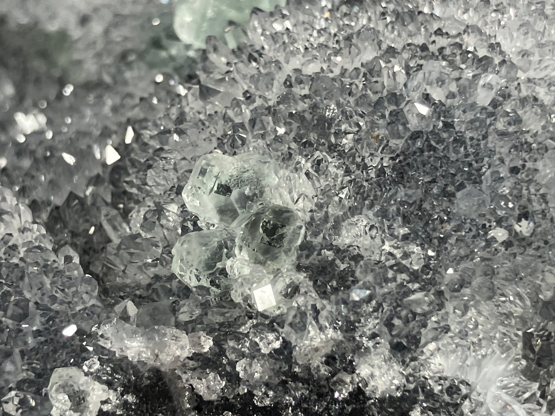 Herrliche hellgrüne Fluoritkristalle auf hochglänzenden kleinen Bergkristallen aufgewachsen.