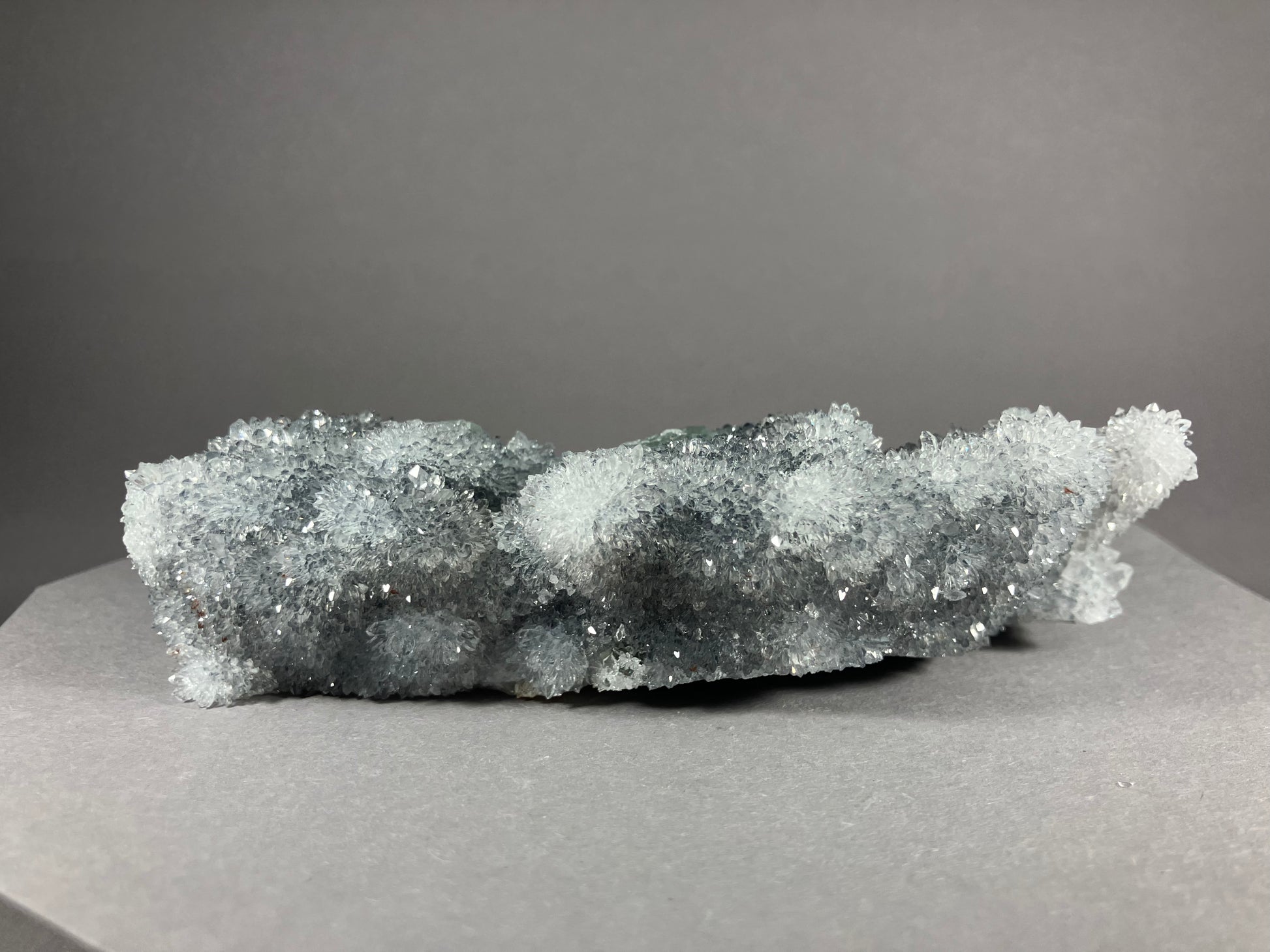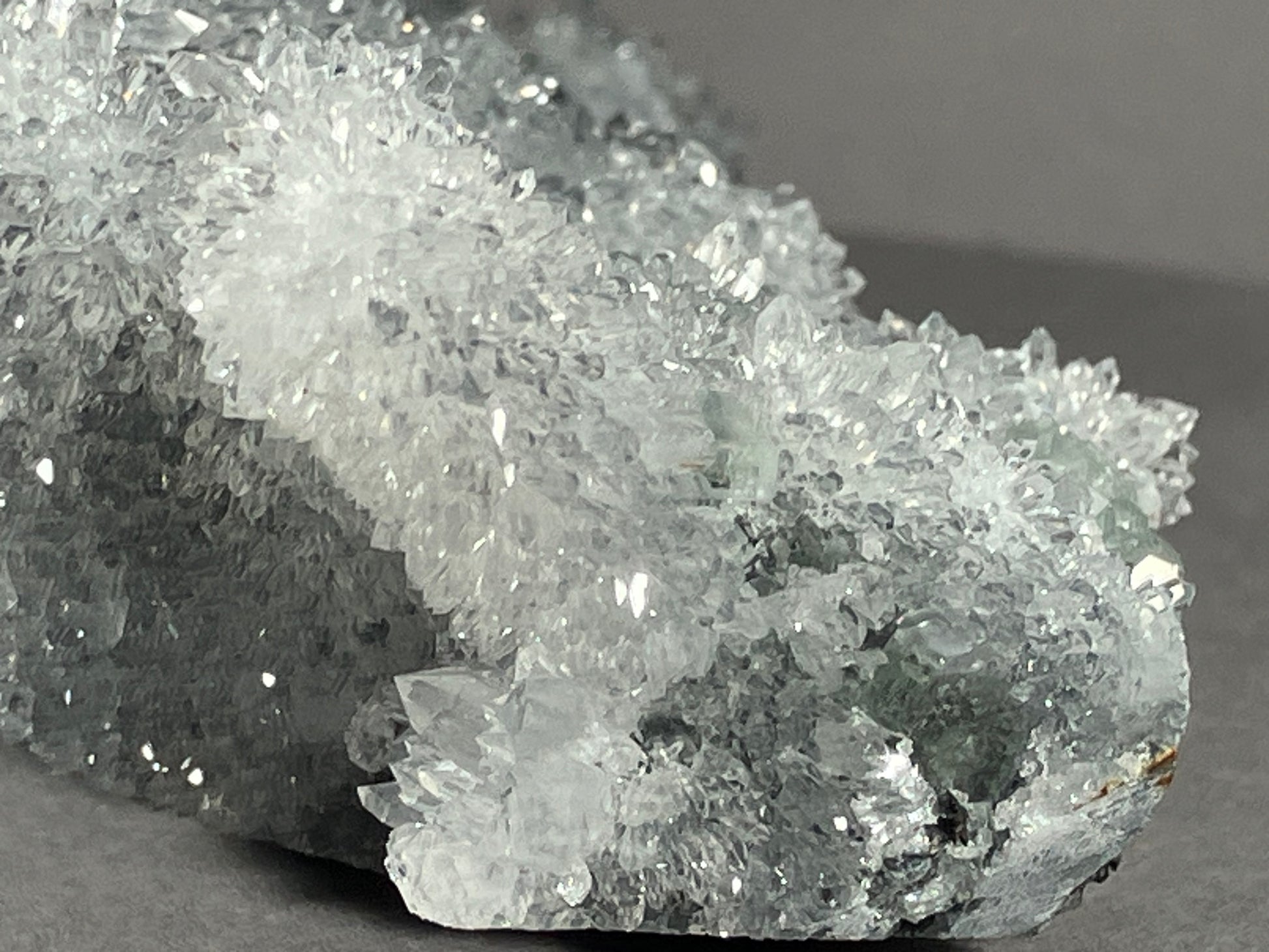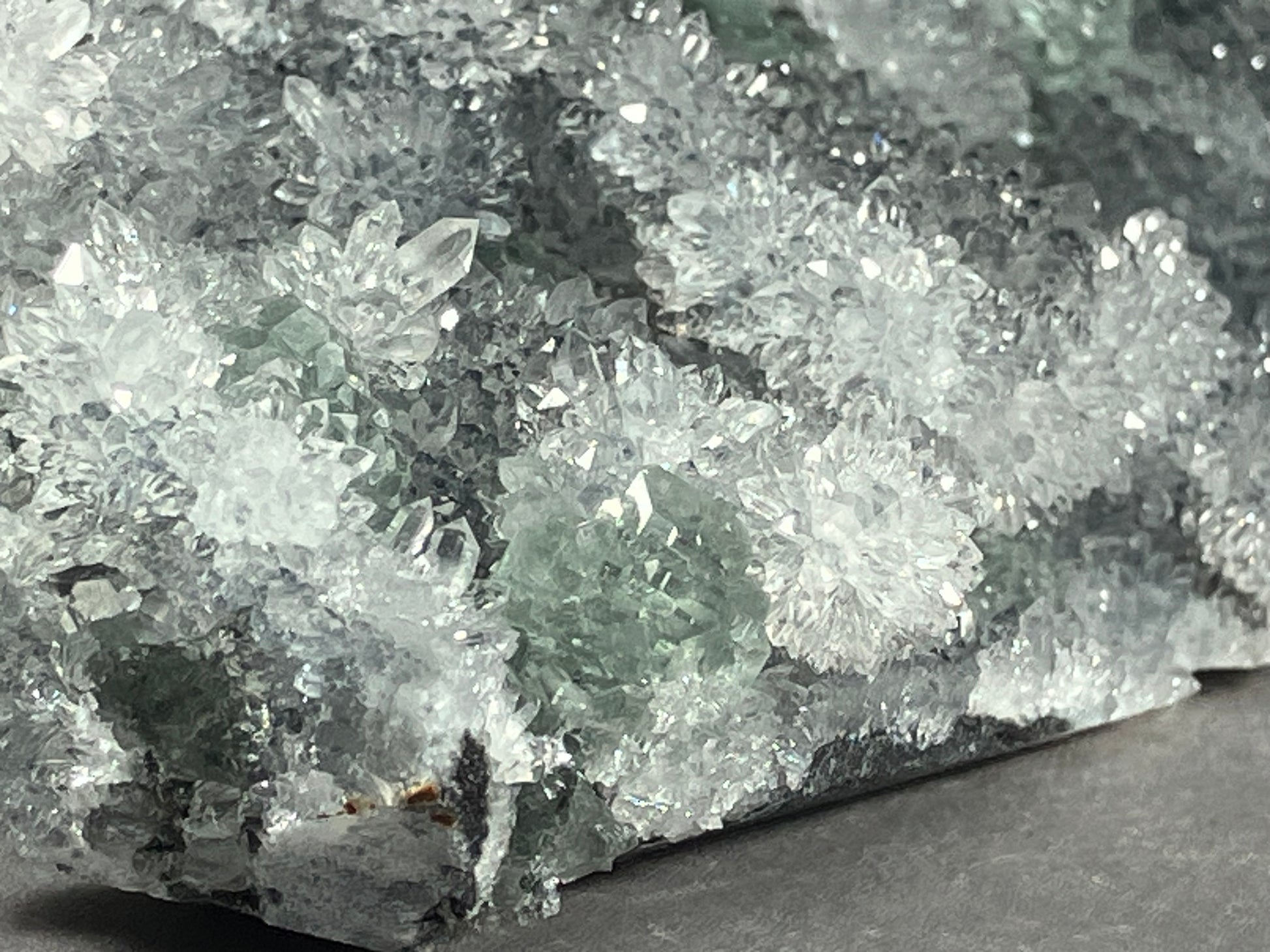 Herrliche hellgrüne Fluoritkristalle auf hochglänzenden kleinen Bergkristallen aufgewachsen.