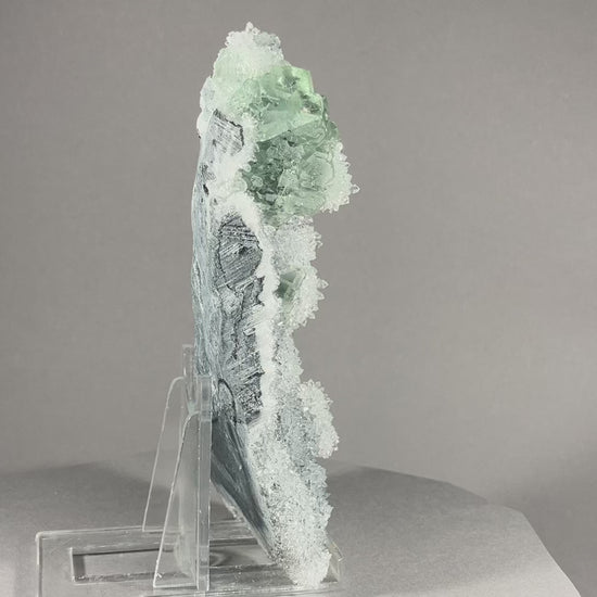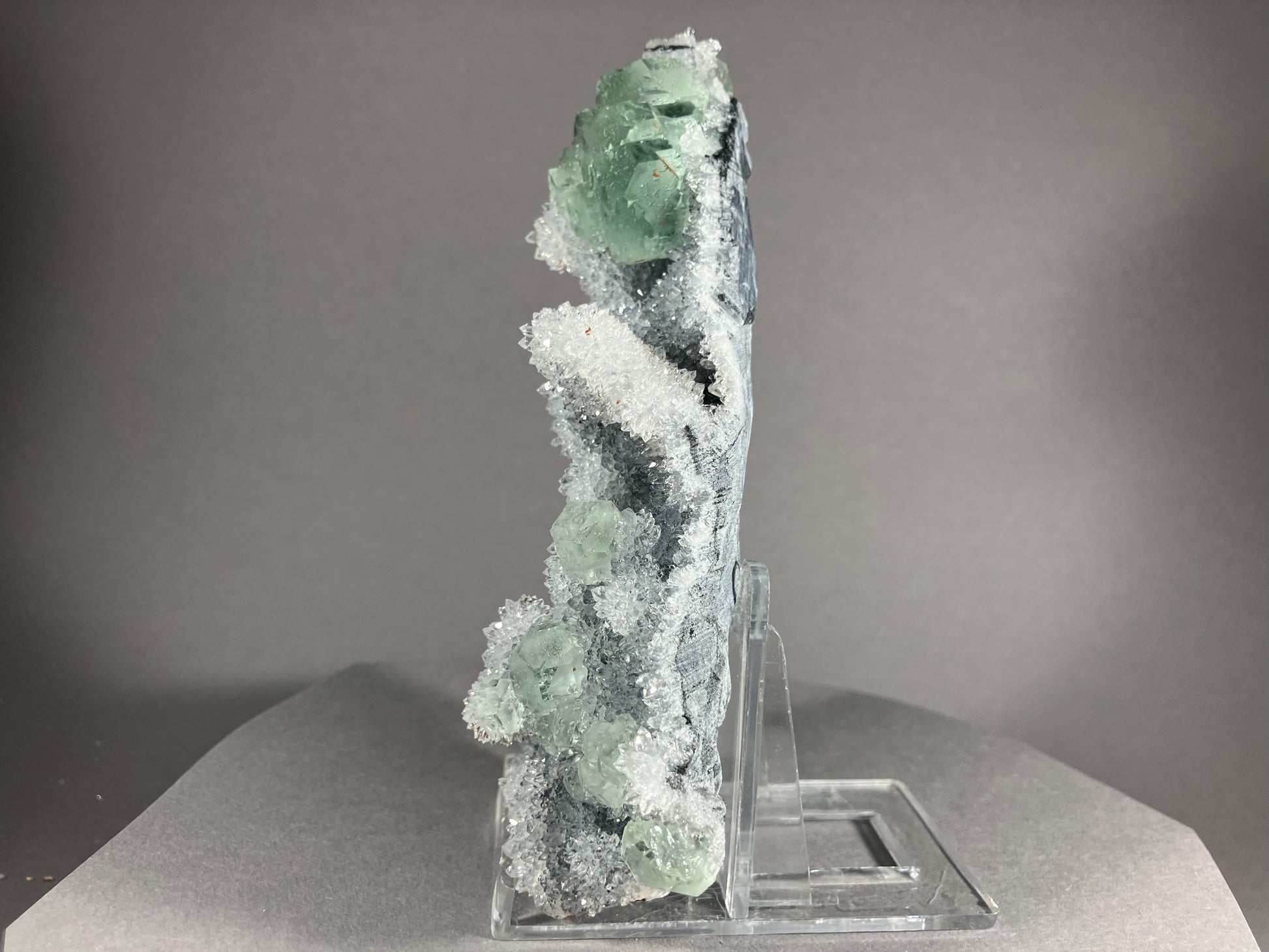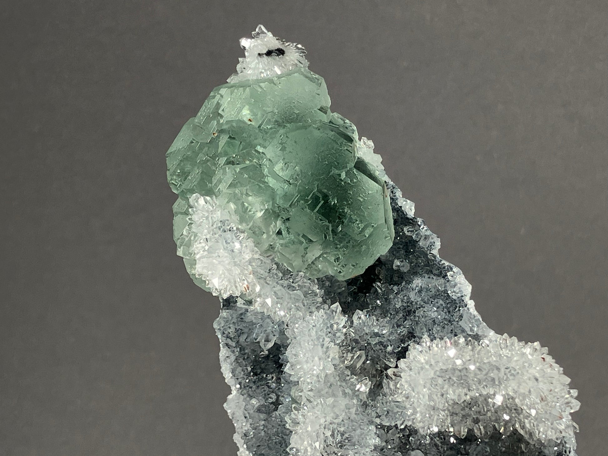 Traumhafte hellgrüne Fluoritkristalle auf hochglänzenden kleinen Bergkristallen aufgewachsen.
