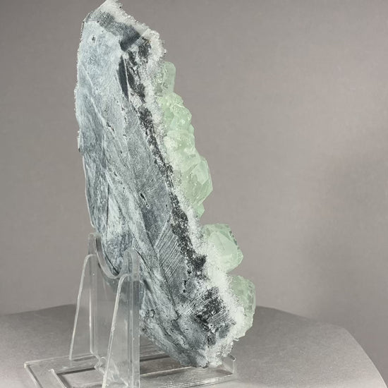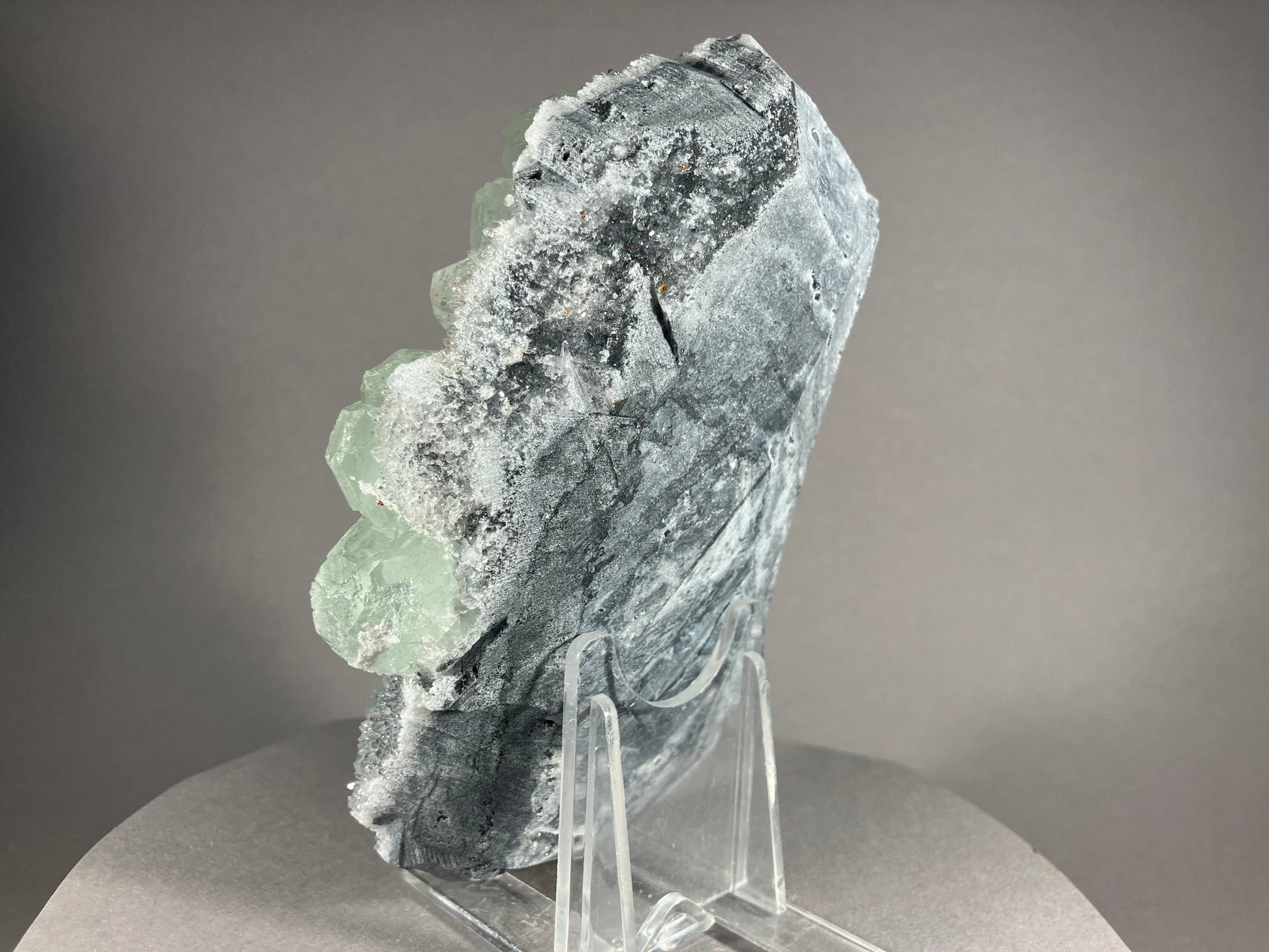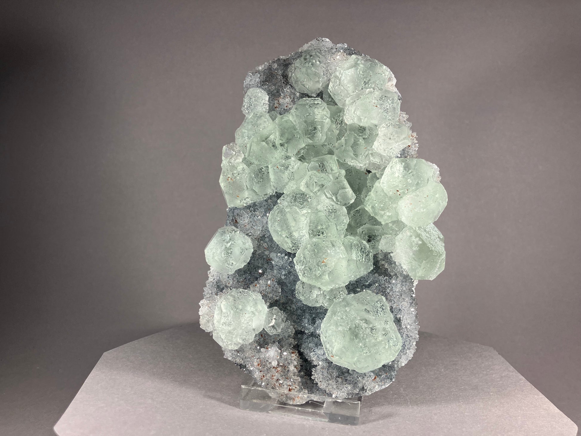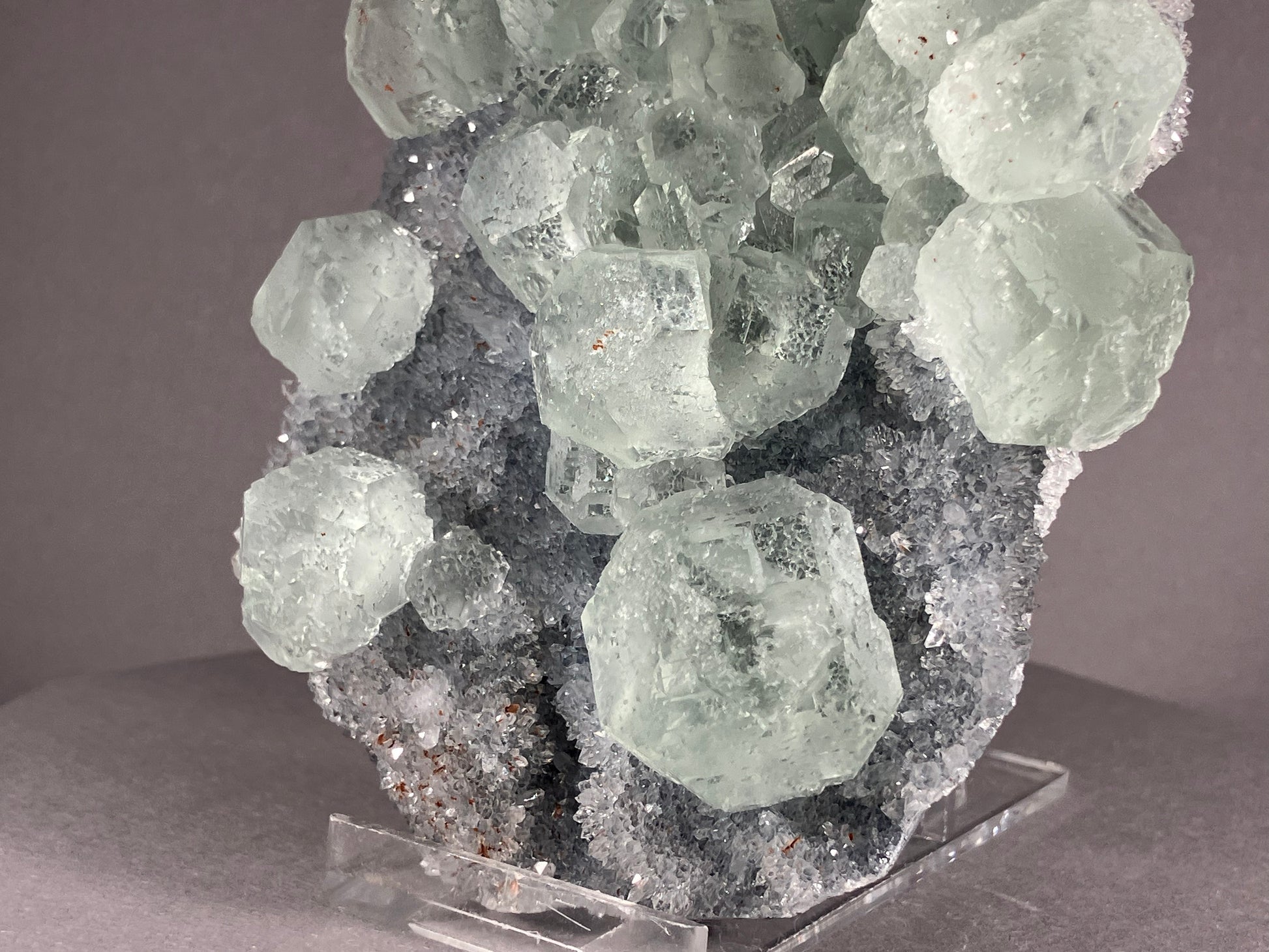 Herrliche hellgrüne relativ große Fluoritkristalle auf hochglänzenden kleinen Bergkristallen aufgewachsen.