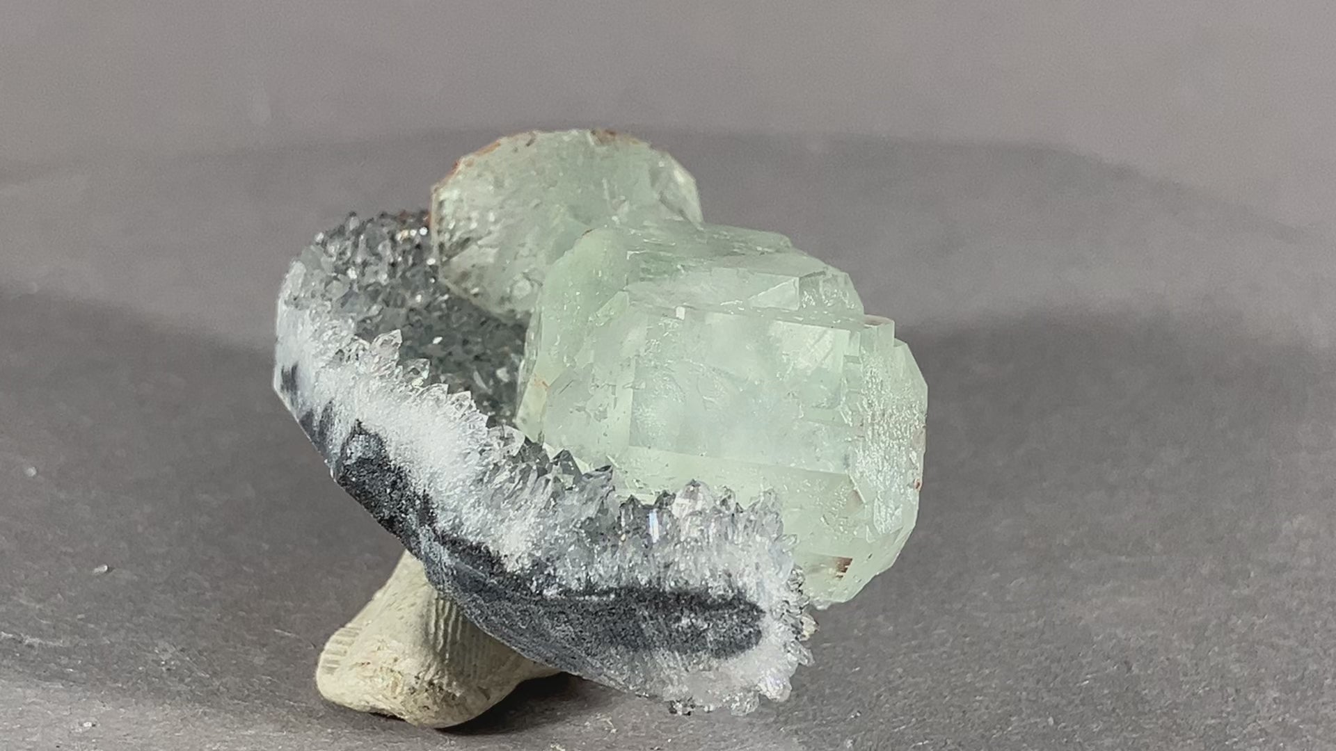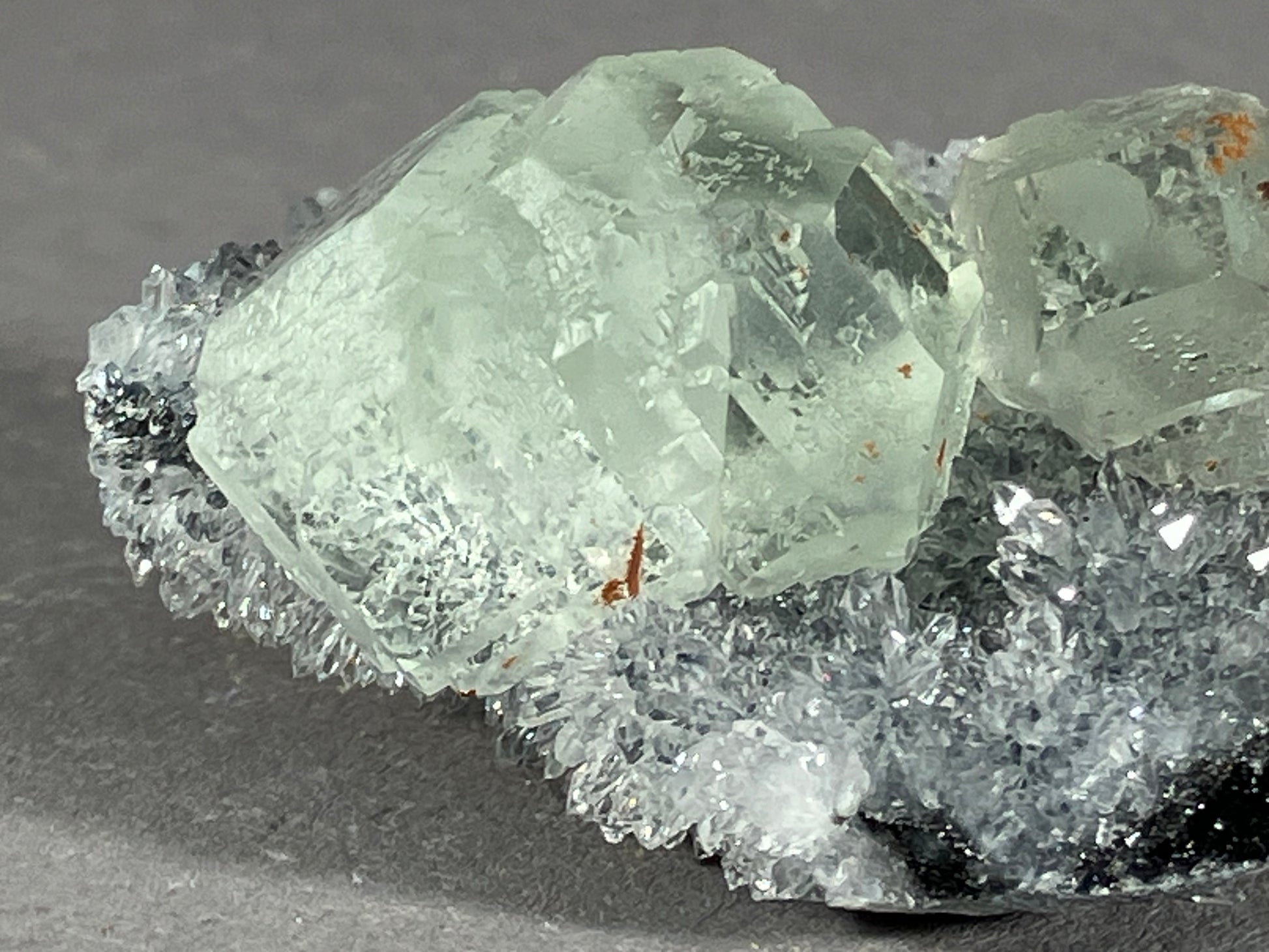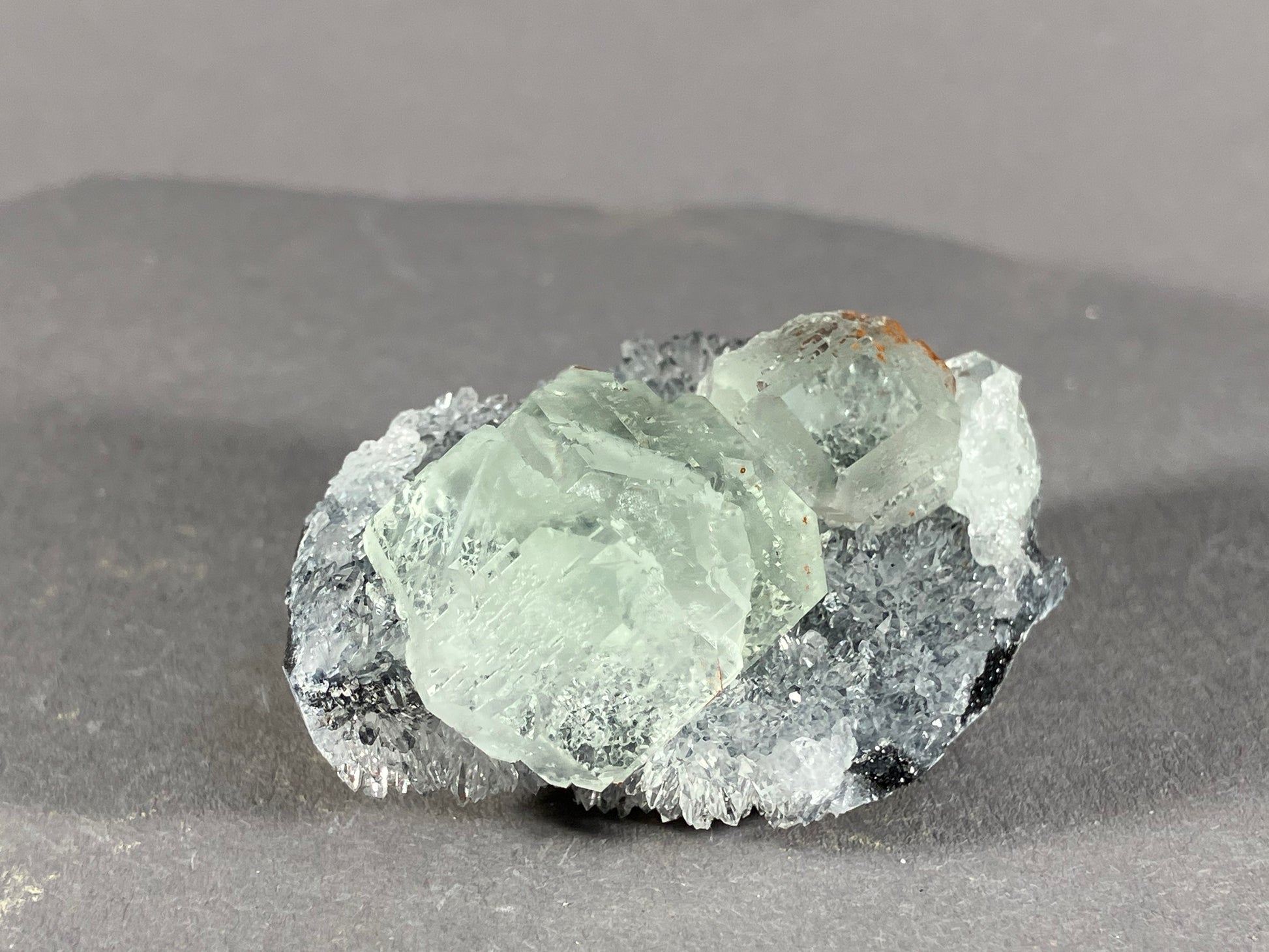 sehr schöne hellgrüne Fluoritkristalle auf hochglänzenden Bergkristallen.