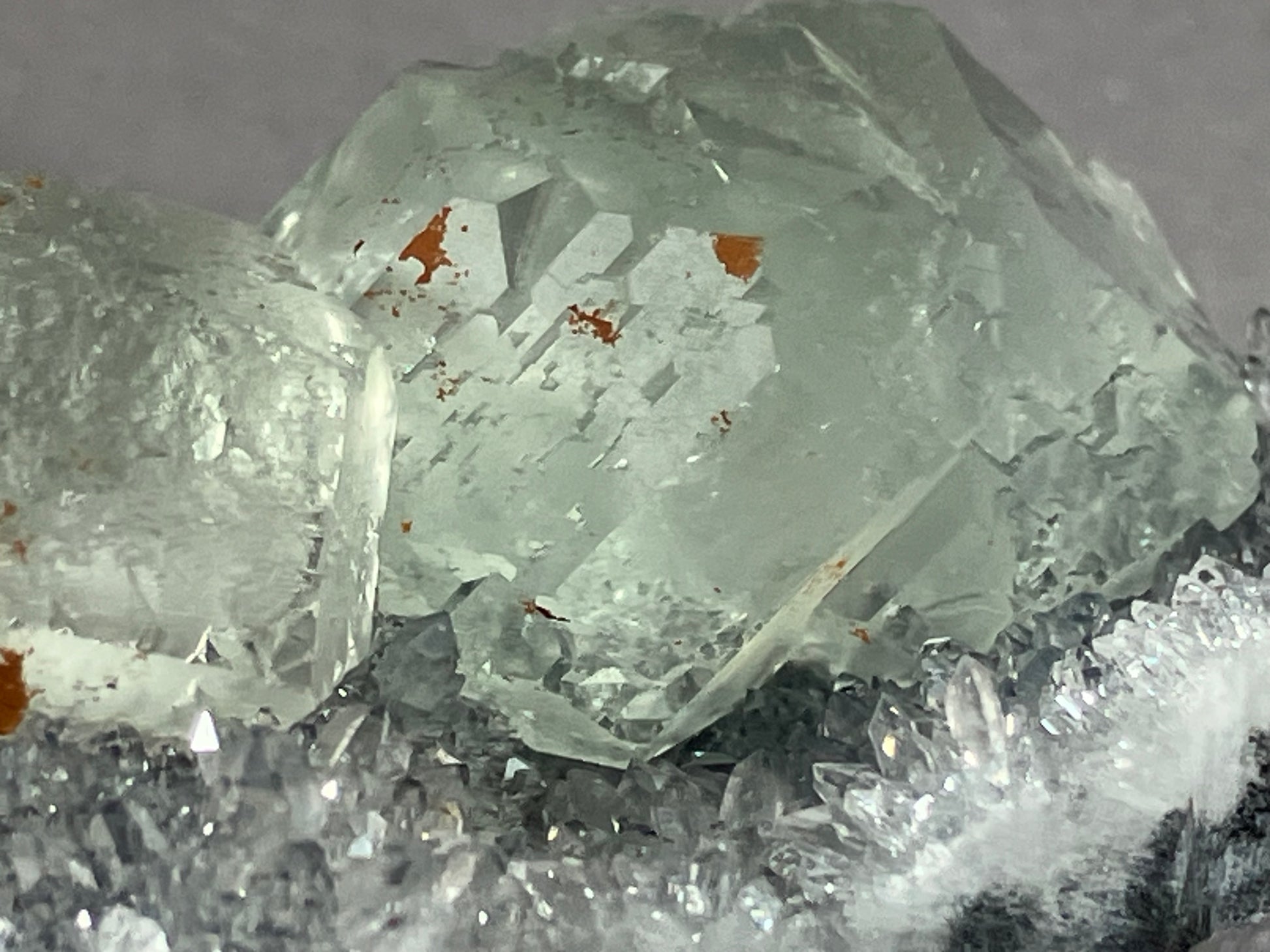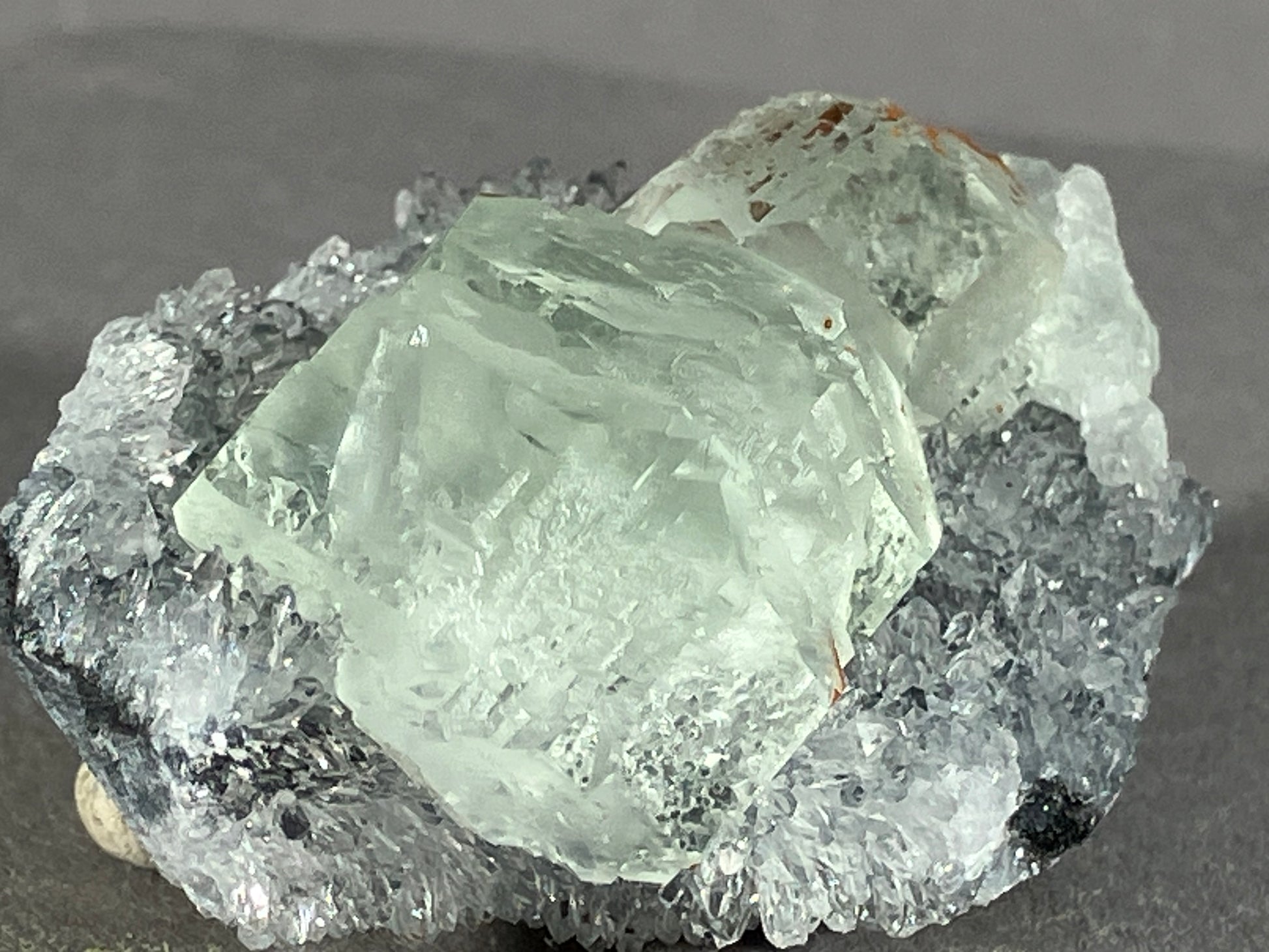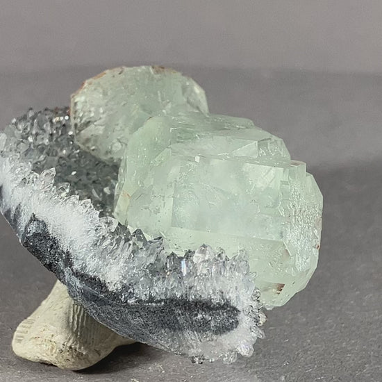 sehr schöne hellgrüne Fluoritkristalle auf hochglänzenden Bergkristallen.