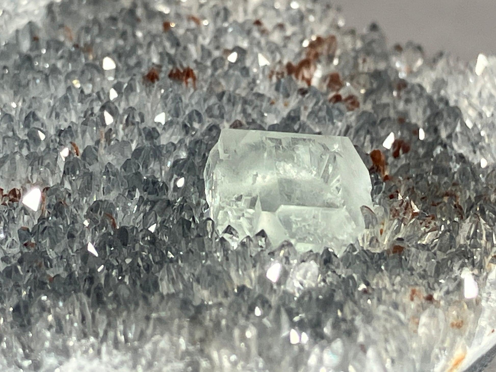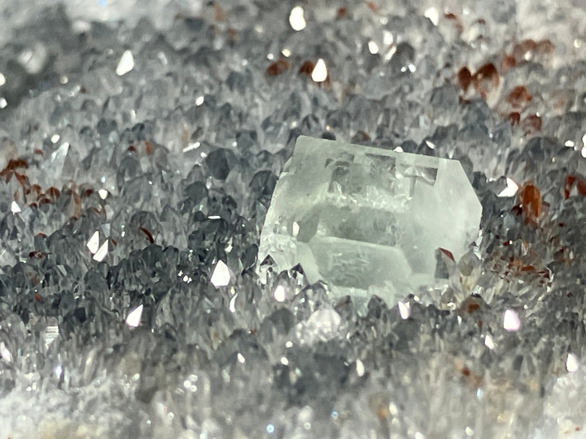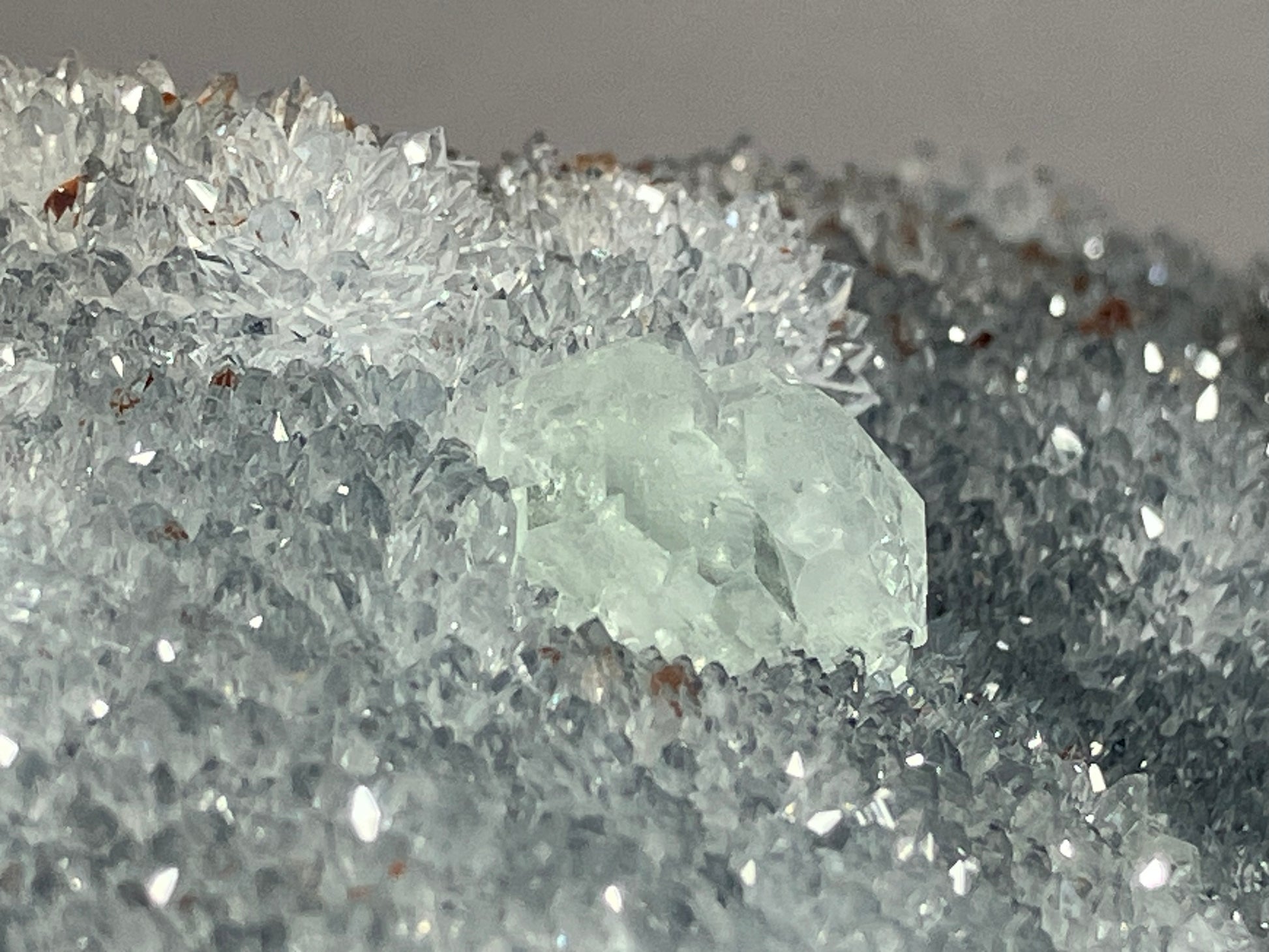 Schöne hellgrüne Fluoritkristalle auf hochglänzenden kleinen Bergkristallen aufgewachsen.