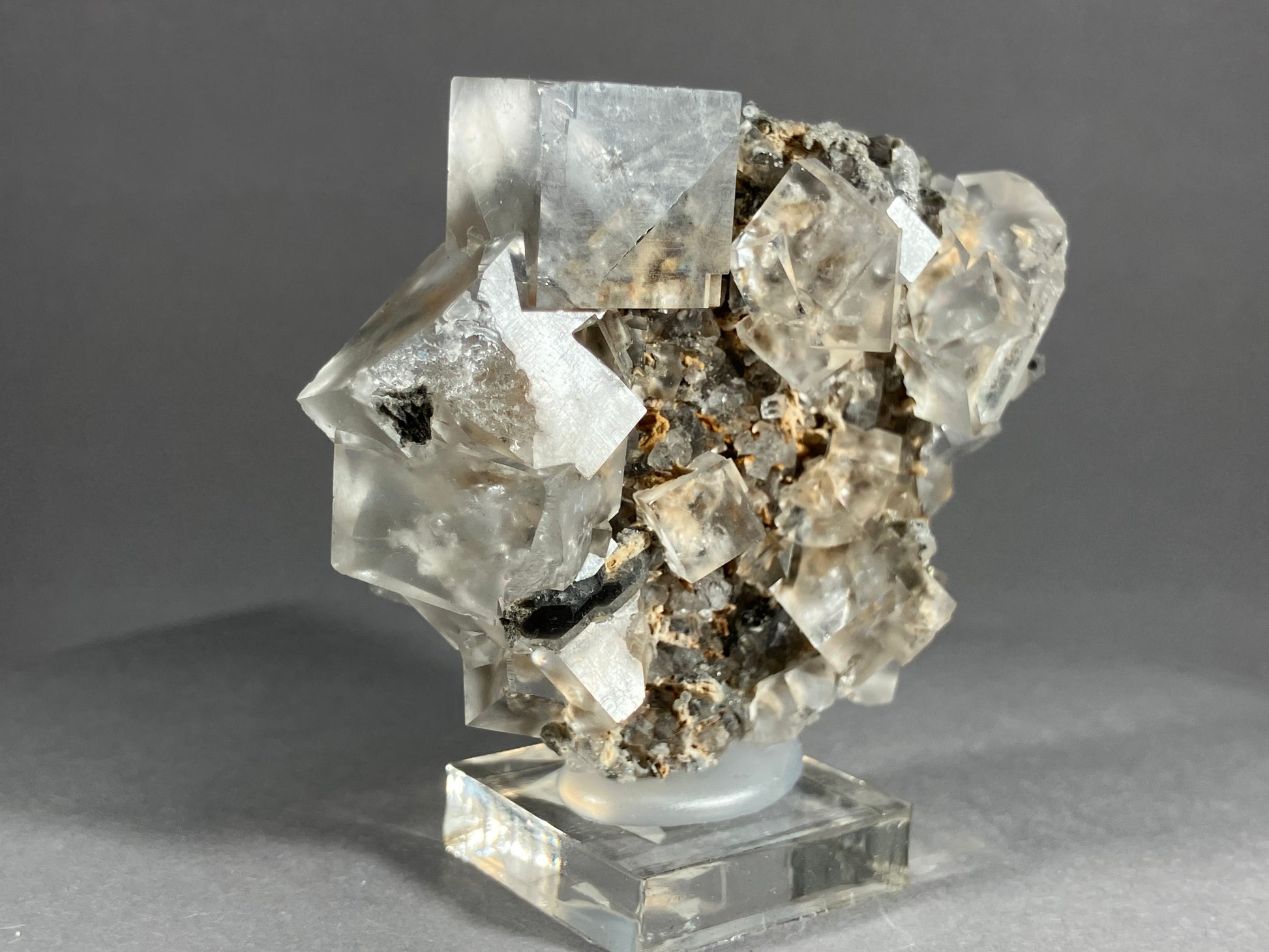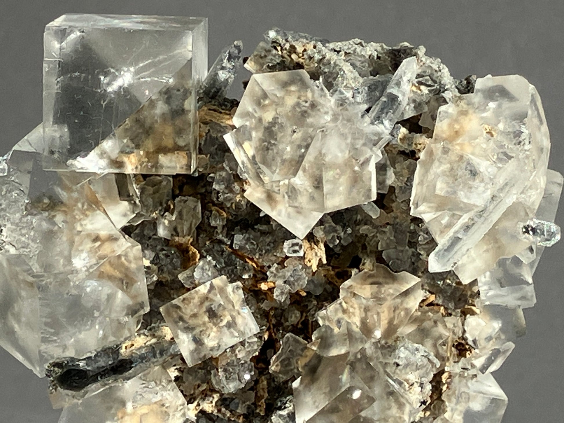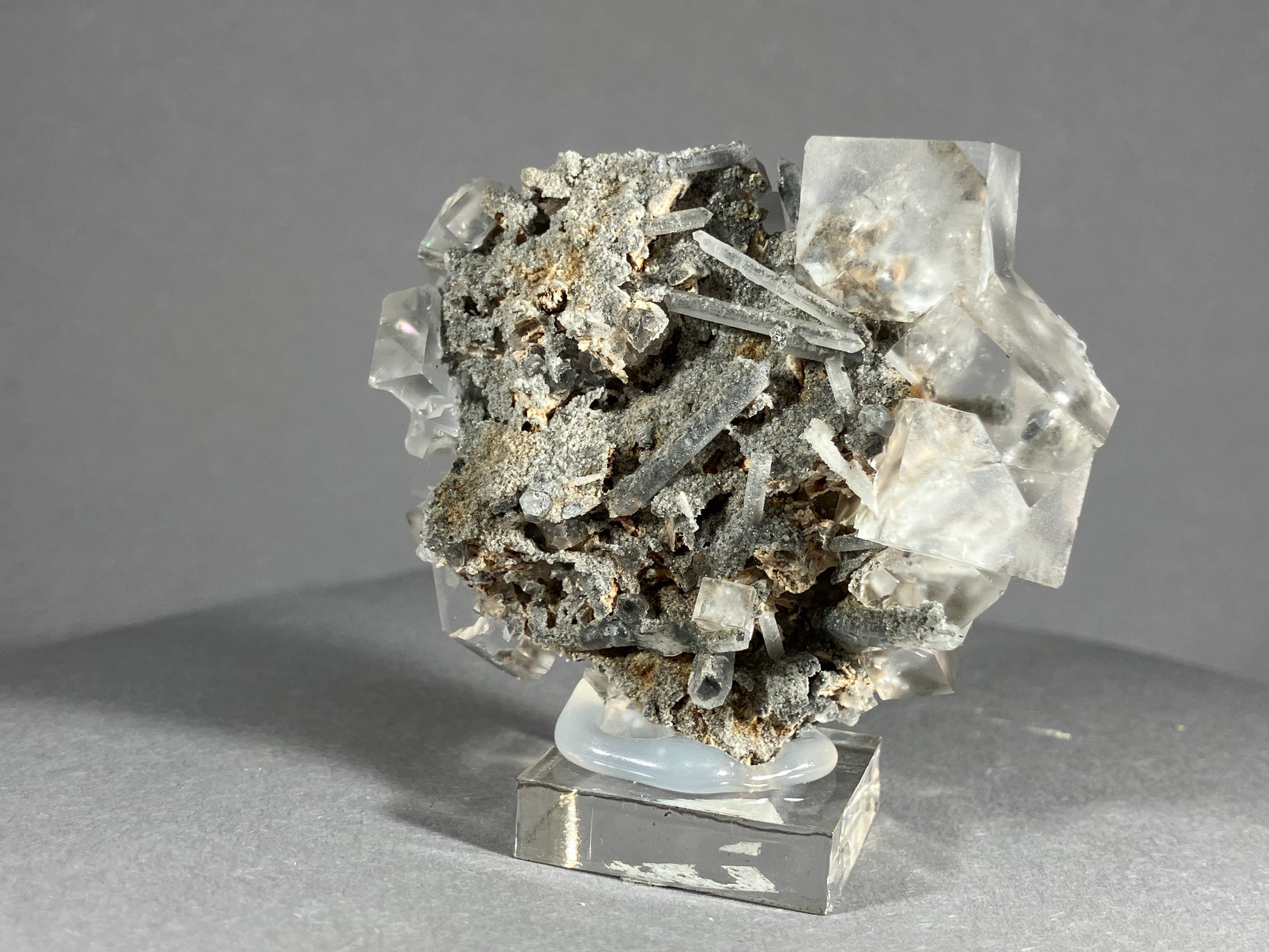 sehr schöne fast glasklare Fluoritwürfel auf Matrix gepaart mit Nadelquarzen.