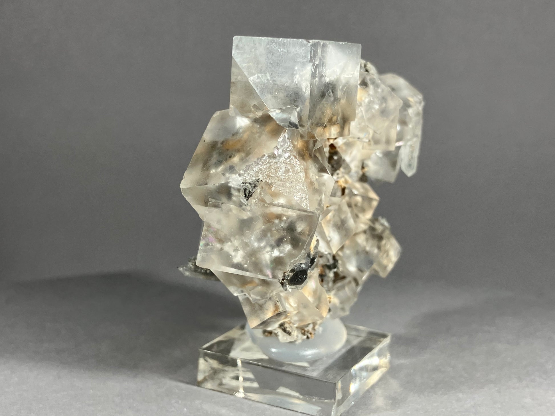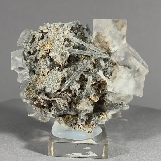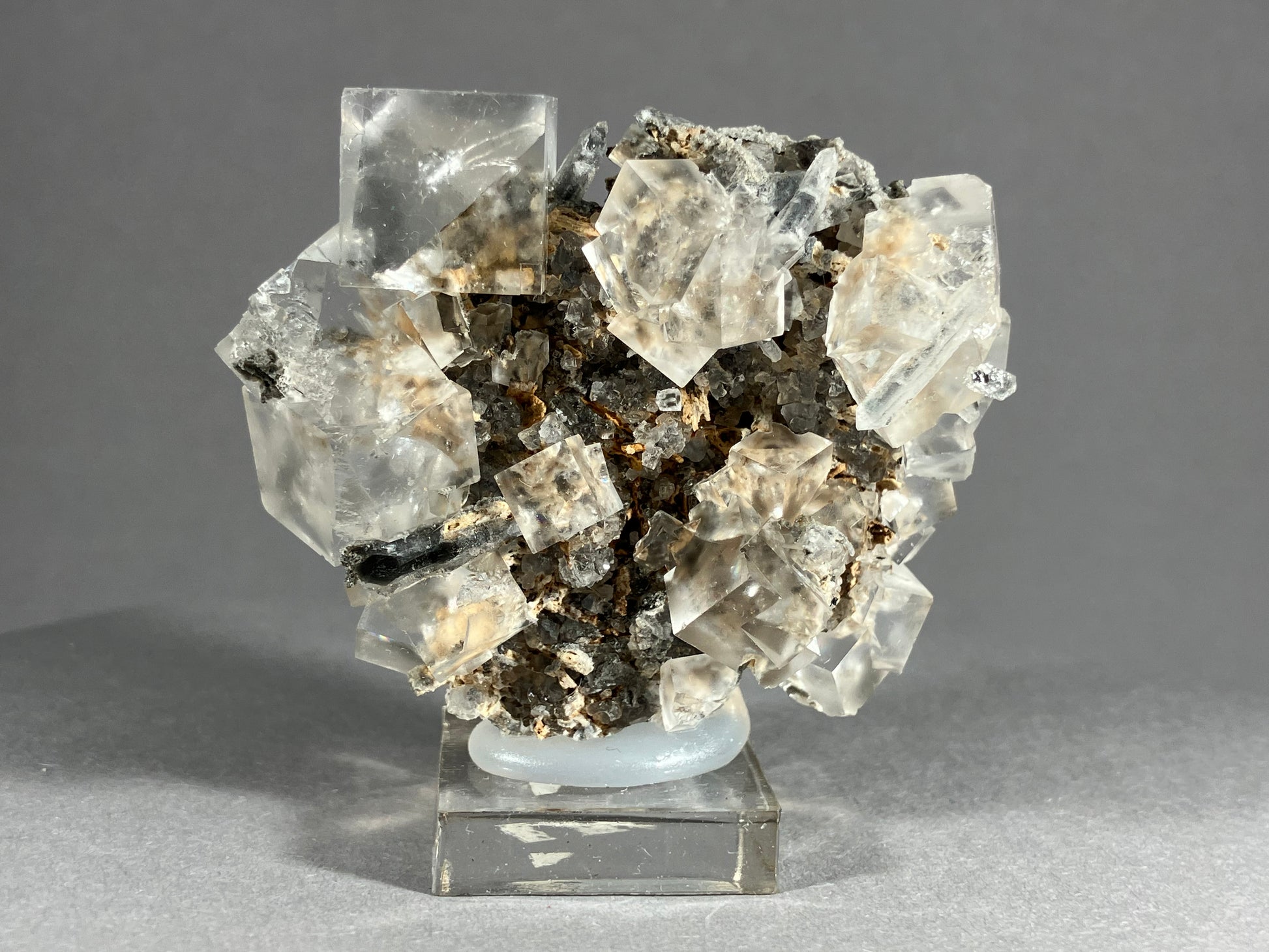 sehr schöne fast glasklare Fluoritwürfel auf Matrix gepaart mit Nadelquarzen.