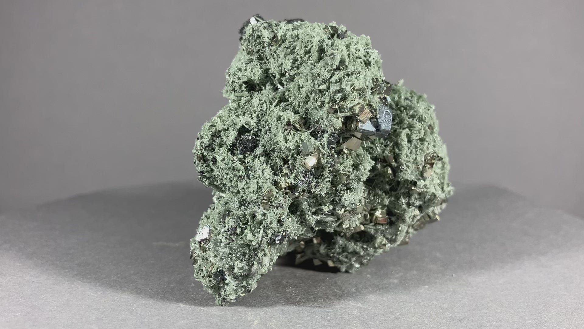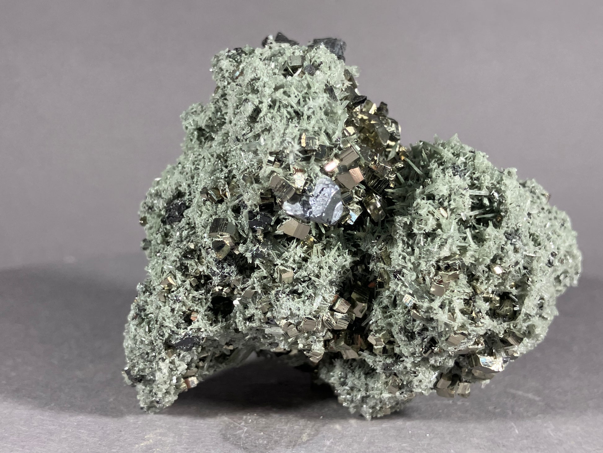 Nette Stufe mit zahlreichen Bergkristallen sogenannten Nadelquarzen und hochglänzendem Pyrit sowie Bleiglanzkristallen.