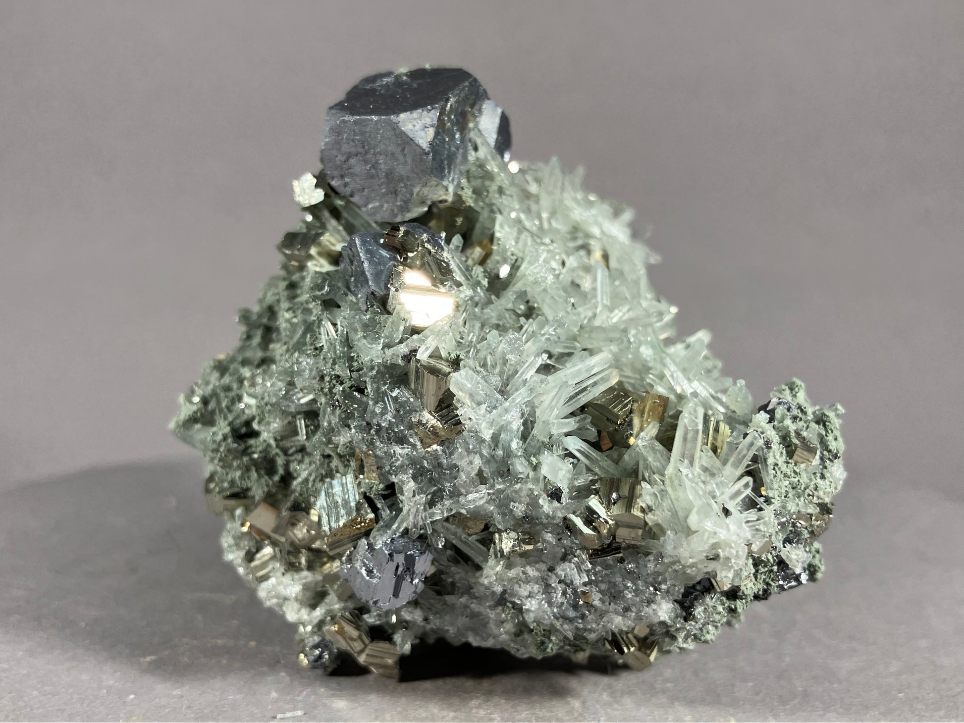 Nette Stufe mit zahlreichen Bergkristallen sogenannten Nadelquarzen und hochglänzendem Pyrit sowie Bleiglanzkristallen.