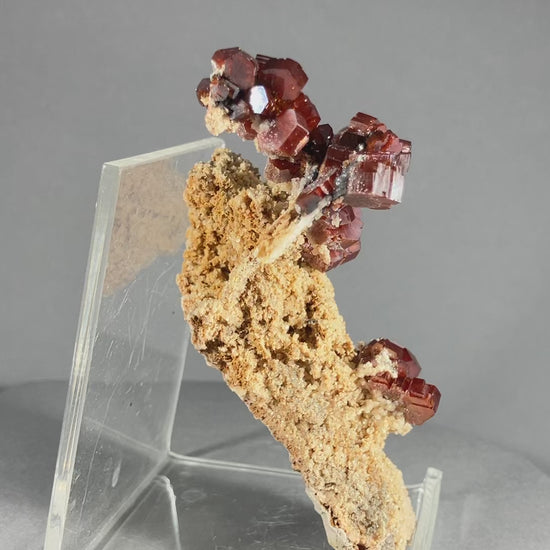 traumhafte und wunderschöne tiefrote Vanadinitkristalle auf Sandsteinmatrix. Relativ dicktafelige Kristalle sitzen perfekt gewachsen au der Matrix.