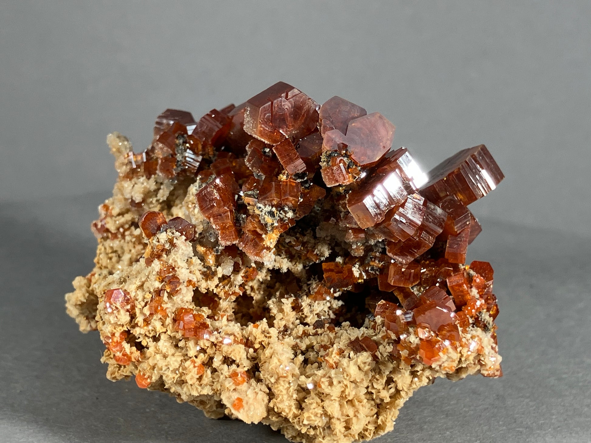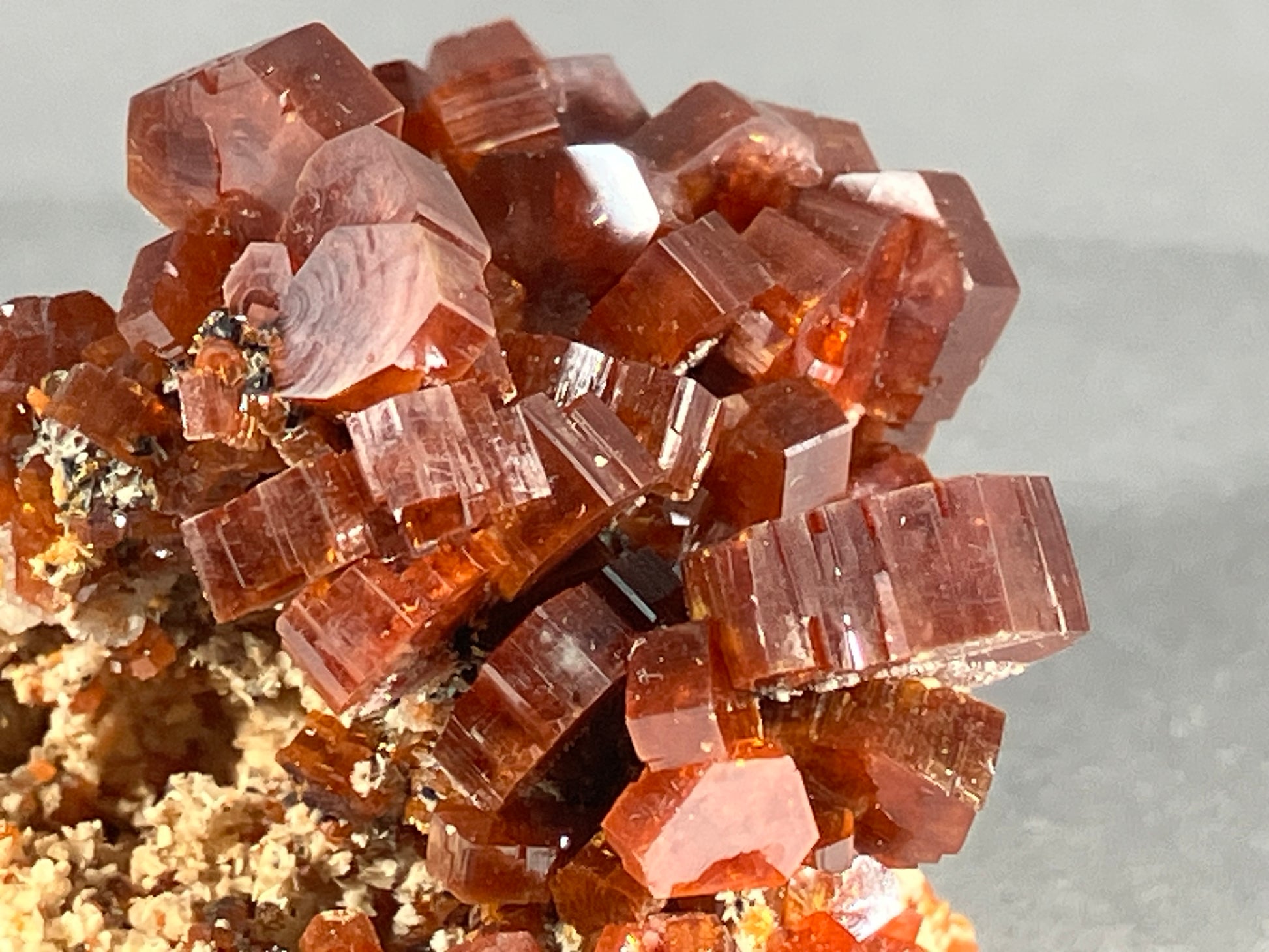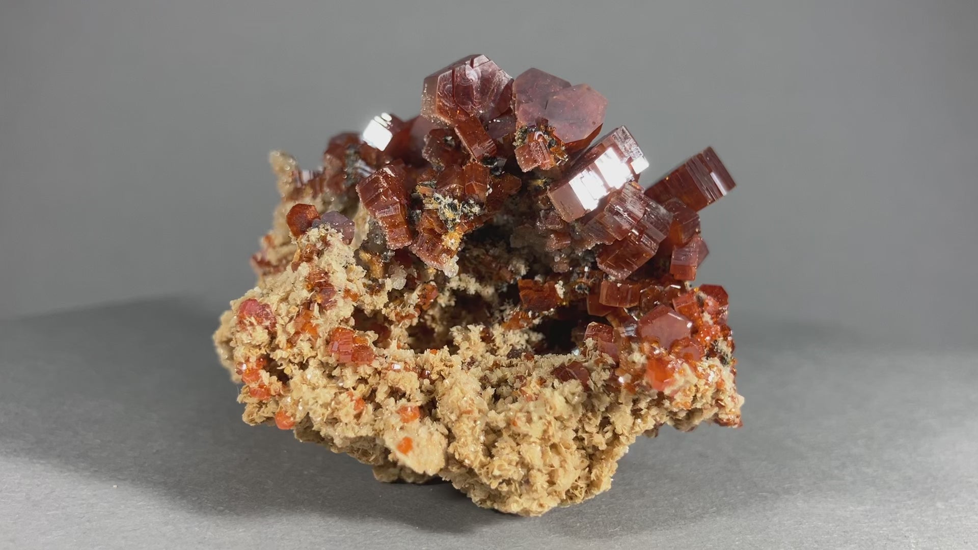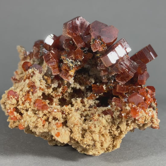 traumhafte und wunderschöne tiefrote Vanadinitkristalle auf Sandsteinmatrix. Dicktafelige Kristalle sitzen perfekt gewachsen auf der Matrix.
