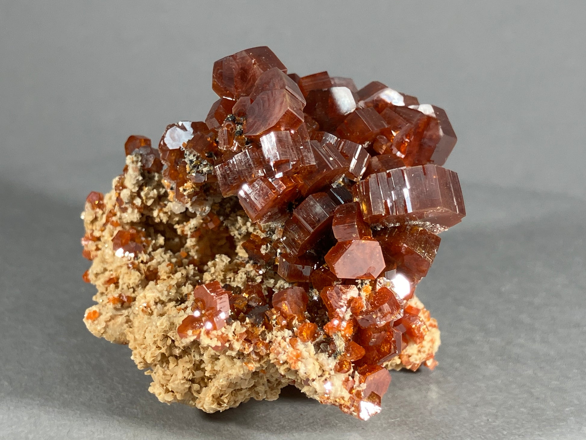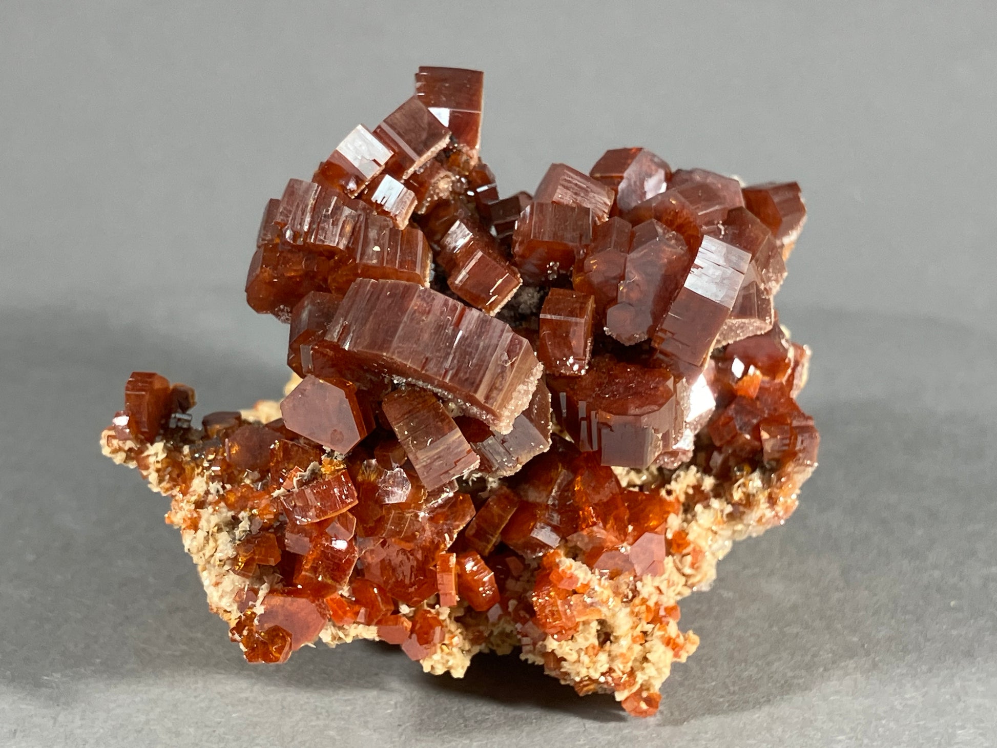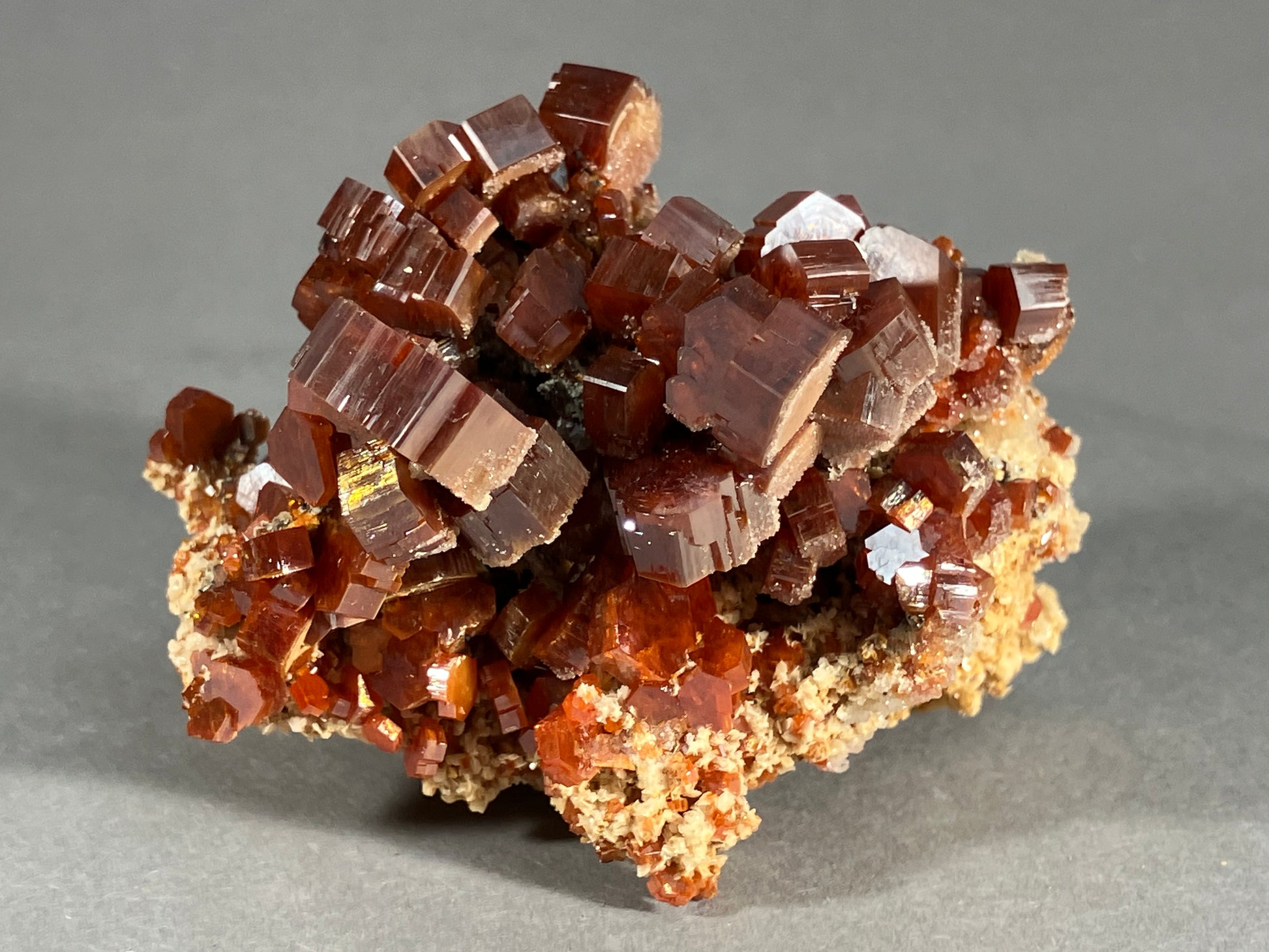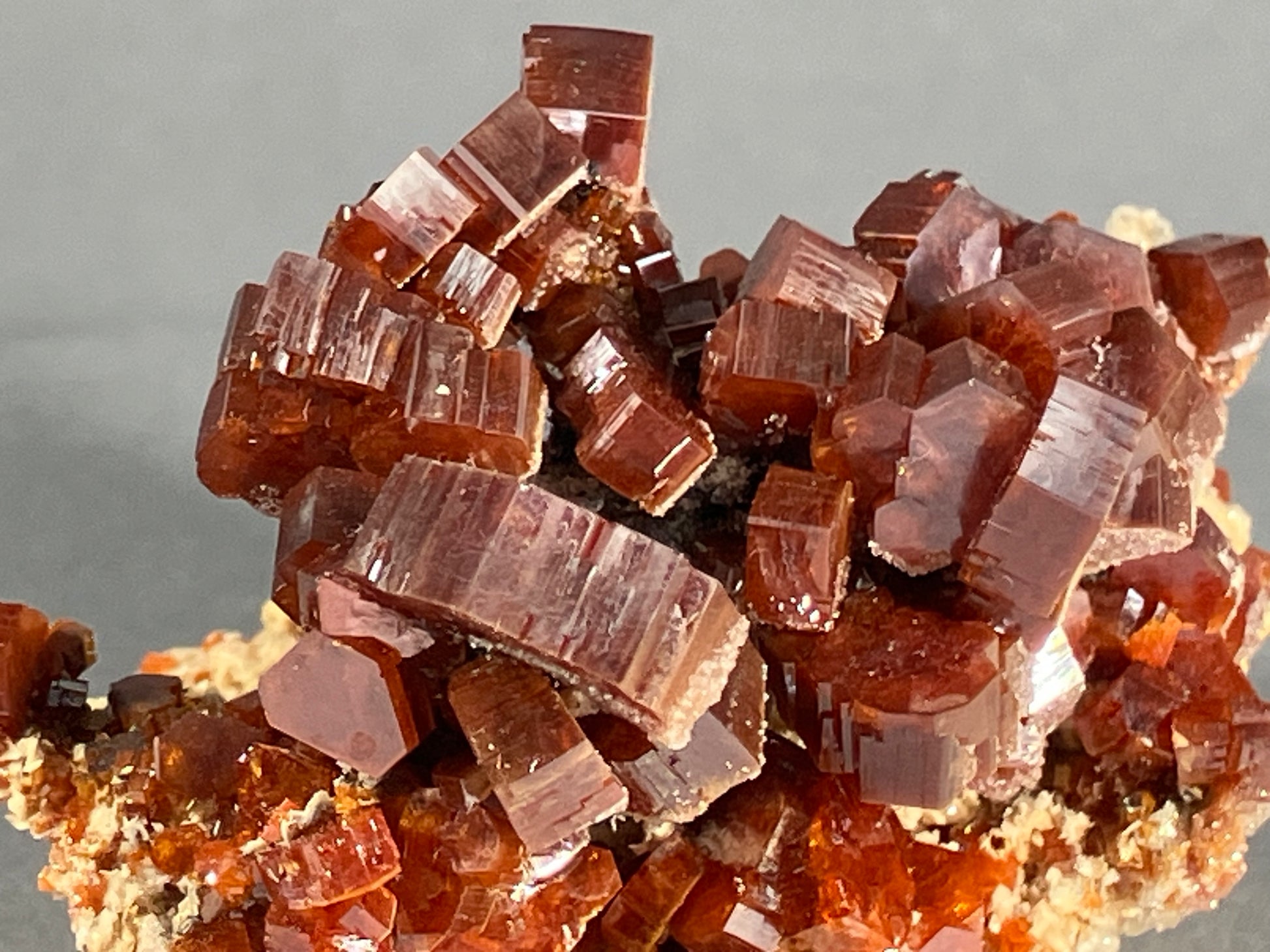 traumhafte und wunderschöne tiefrote Vanadinitkristalle auf Sandsteinmatrix. Dicktafelige Kristalle sitzen perfekt gewachsen auf der Matrix.