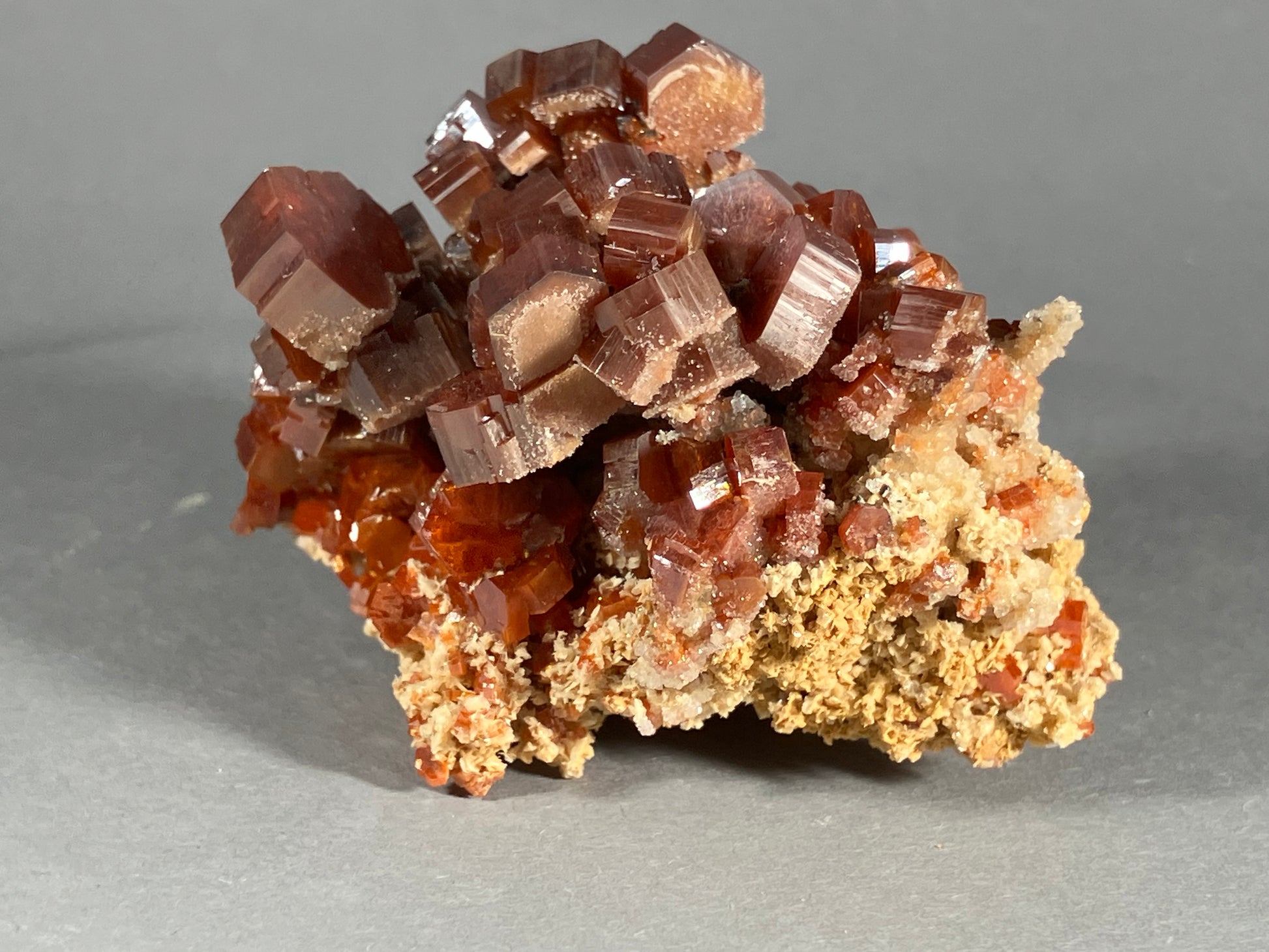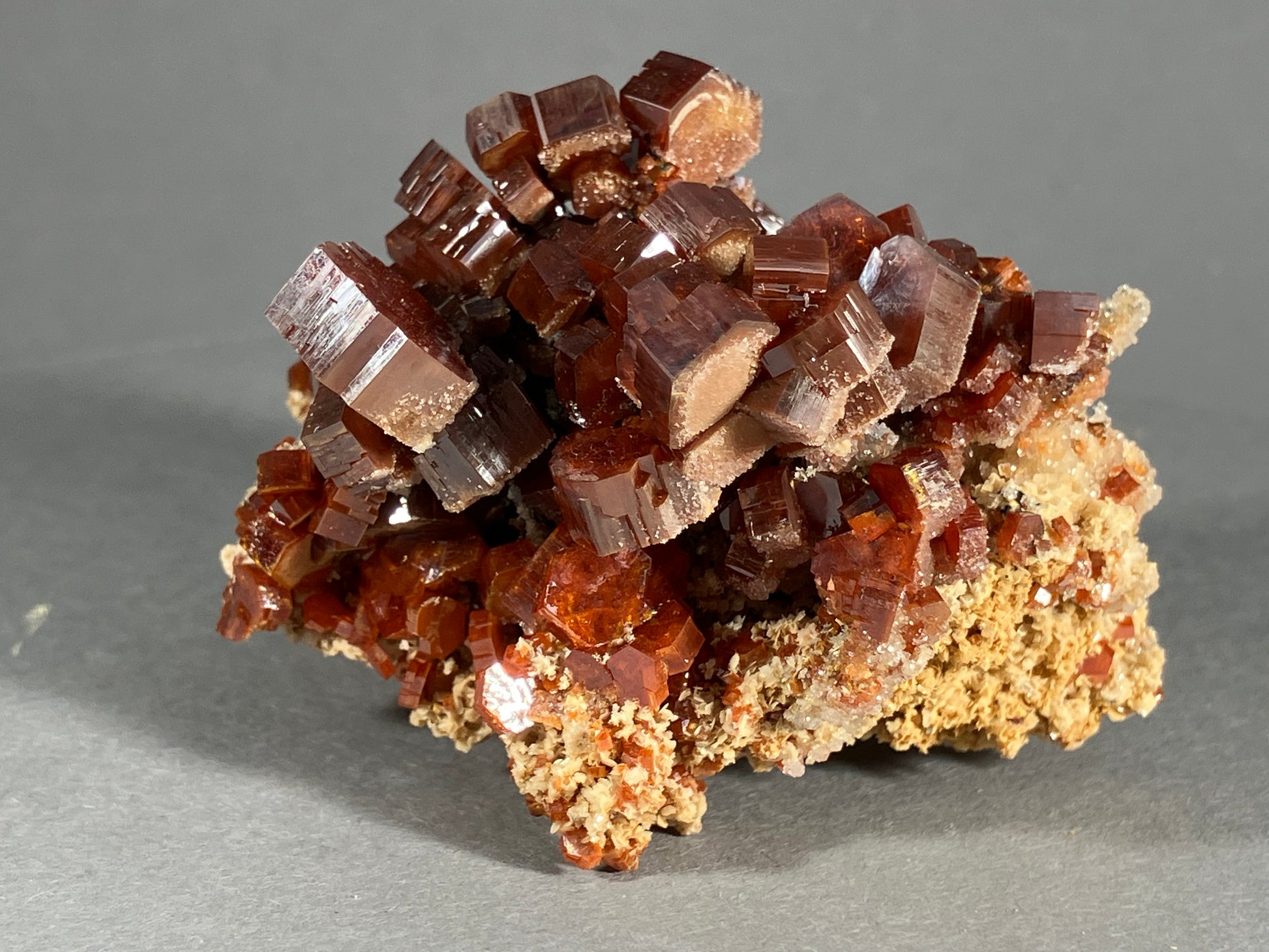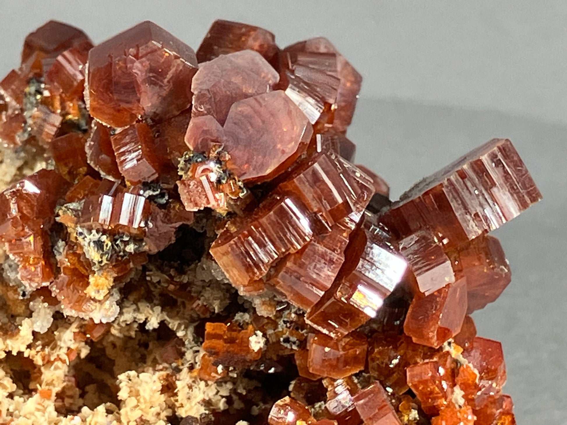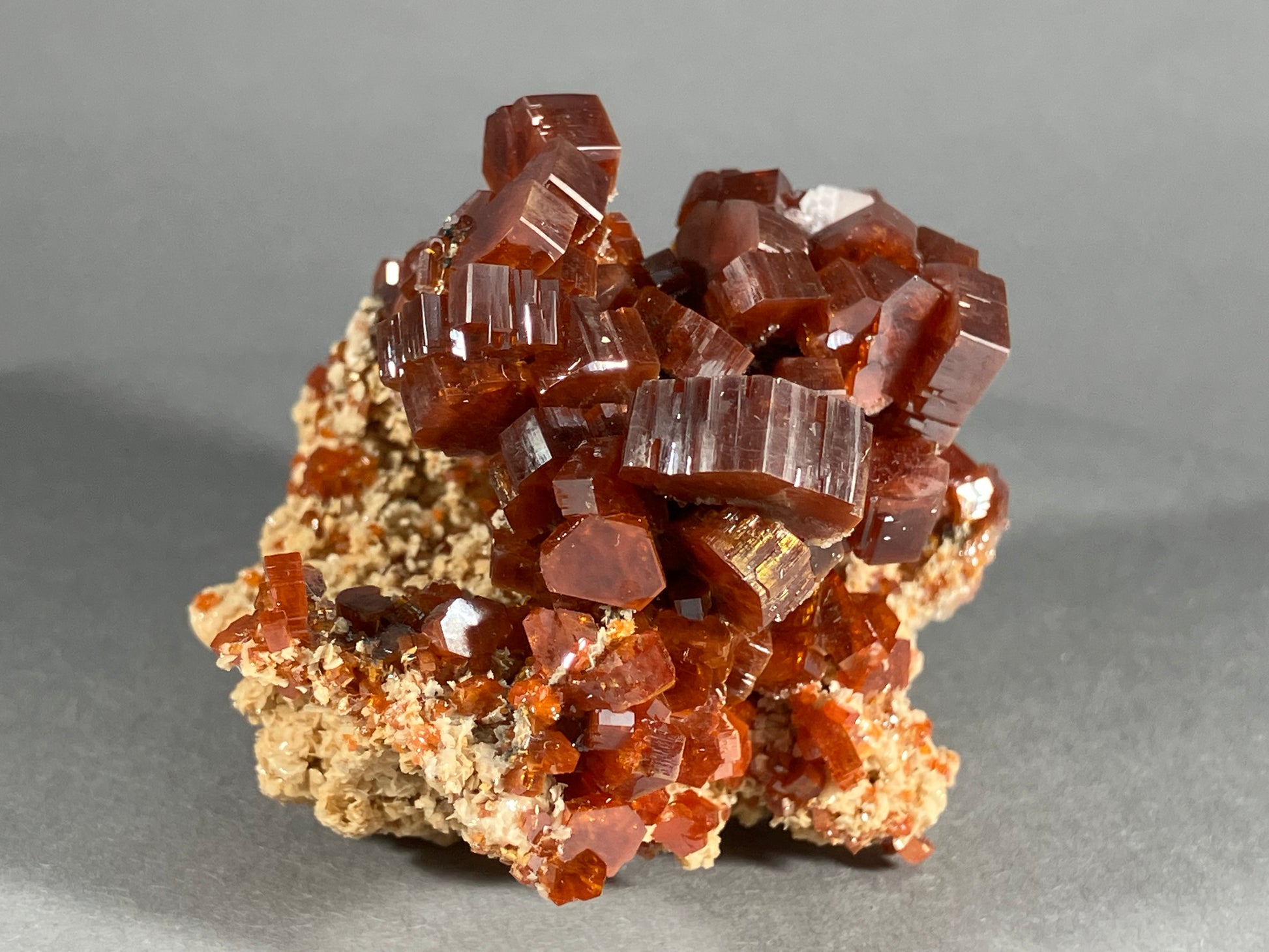 traumhafte und wunderschöne tiefrote Vanadinitkristalle auf Sandsteinmatrix. Dicktafelige Kristalle sitzen perfekt gewachsen auf der Matrix.
