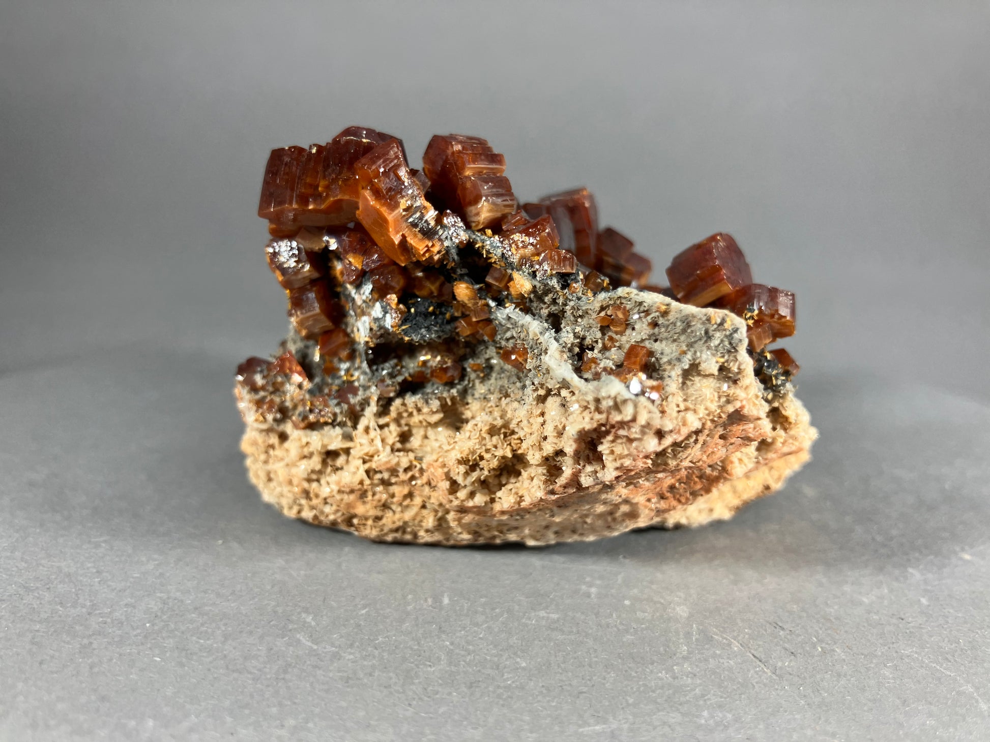 Traumhafte und wunderschöne tiefrote und vergleichsweise dicke Vanadinitkristalle auf Sandsteinmatrix. Perfekt gewachsen auf der Sandsteinmatrix.